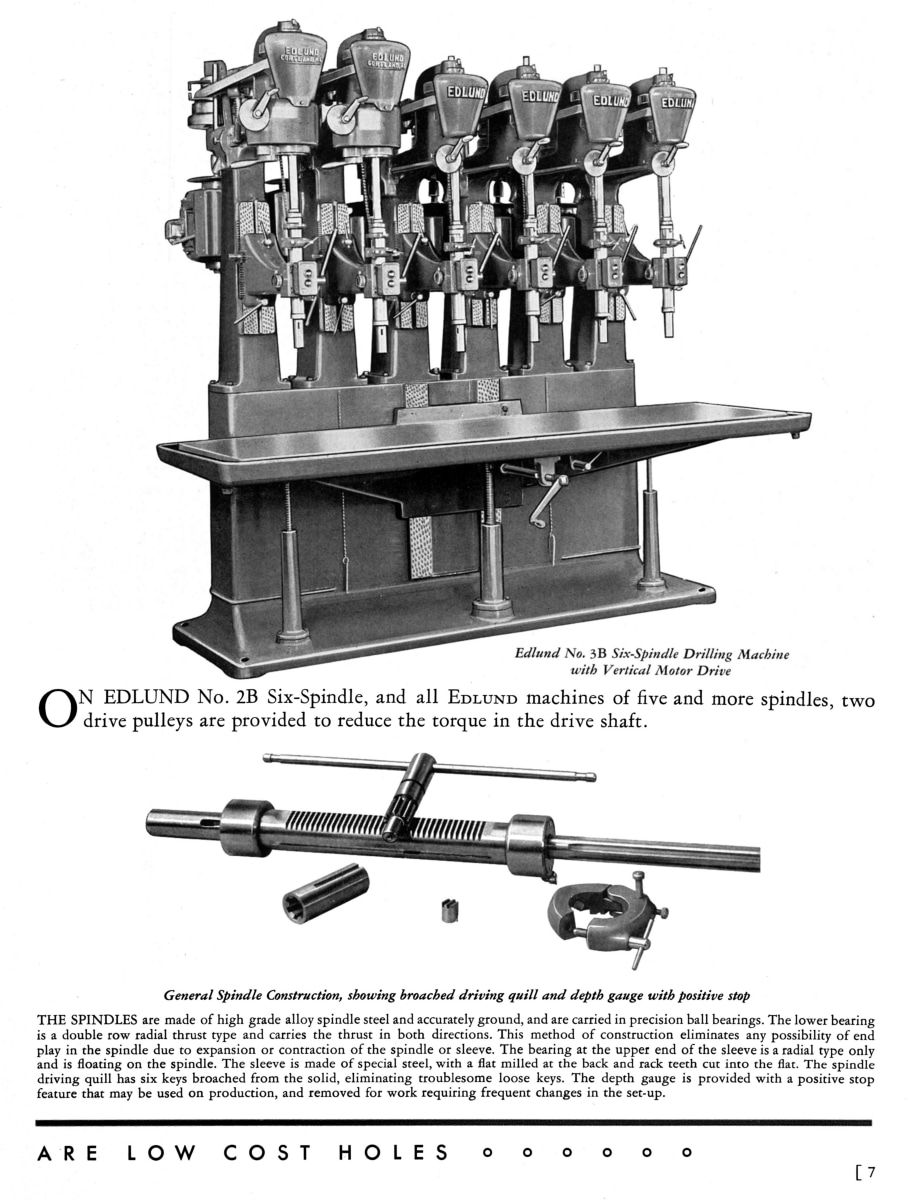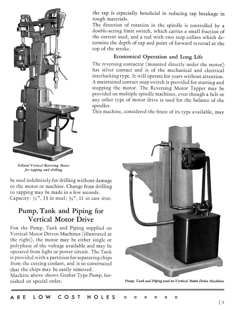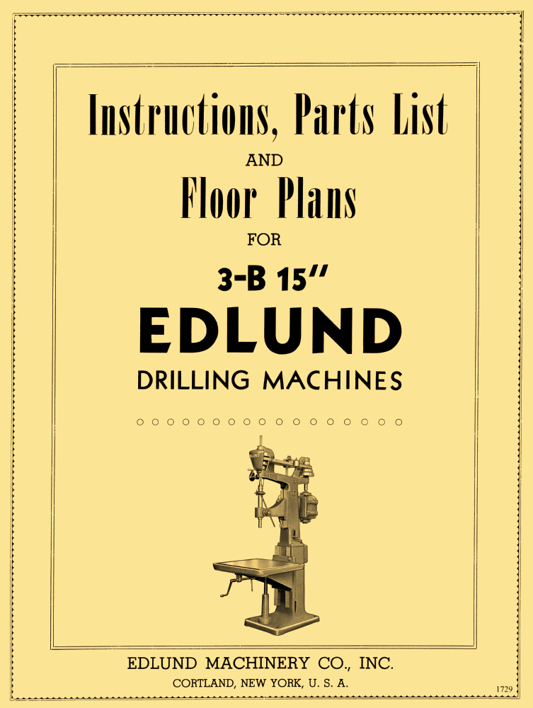 This is a reproduction, not a photocopy, of an original Edlund No. 3B-15″ Sensitive Drill Press and Tapping Machines Parts Manual with extra sales literature. There is one basic page of lubricating and operating instructions. This manual has detailed cross-sectional schematics and parts diagrams with parts lists that identify every internal component from the cone pulleys to the spindle sleeves. The parts diagrams include the back gear and the No. 10 power feed. We added an 8-page sales bulletin that was included with the manual. This Edlund bulletin includes pictures of the machines and optional accessories like, No. 10 Semi-Automatic Power Feed, the reversing motor, pump, tank and piping for the vertical motor drive, the ball bearing motor drive, and all the drill and tapping machine specifications for the different models available. The bulletin provides motor speed chart as well with the different RPM options.