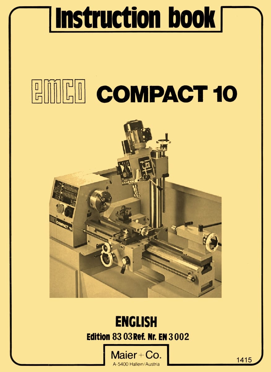 This is a reproduction, not a photocopy, of a Emco Compact 10 Metal Lathe Owner Operator Instructions Manual. This manual contains information about the metal lathe specifications, installation/lifting instructions, and lathe dimensions. The manual contains instructions on how to operate the various parts of this metal lathe, and contains the feed/thread charts. There is a section on proper lubricating and maintenance instructions, and a lubricating chart. This EMCO manual has a trouble shooting section and wiring diagrams.