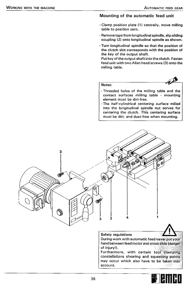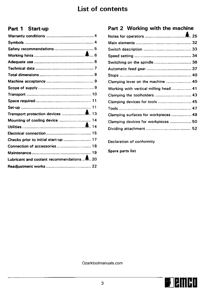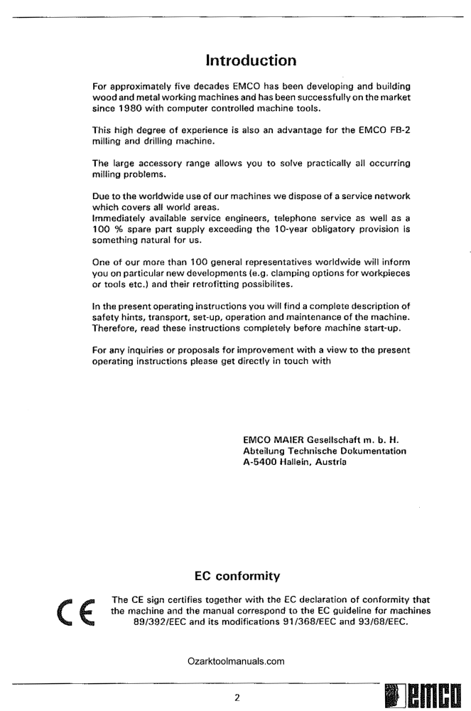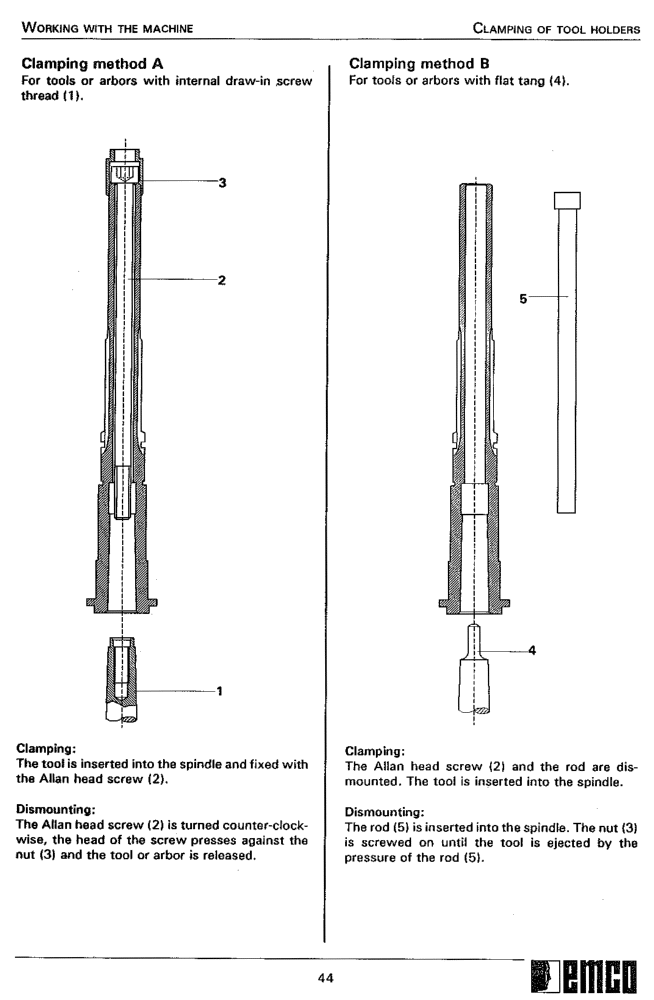 This is a reproduction of an original Emco FB-2 Milling Machine Owners Instructions Manual. This manual contains information on the mill specifications, how to properly install this mill, and the correct wiring connections for the different variants. It also has proper lubricating instructions, and how to adjust for backlash. The Emco manual shows the various attachments and accessories available, and explains how to use them.