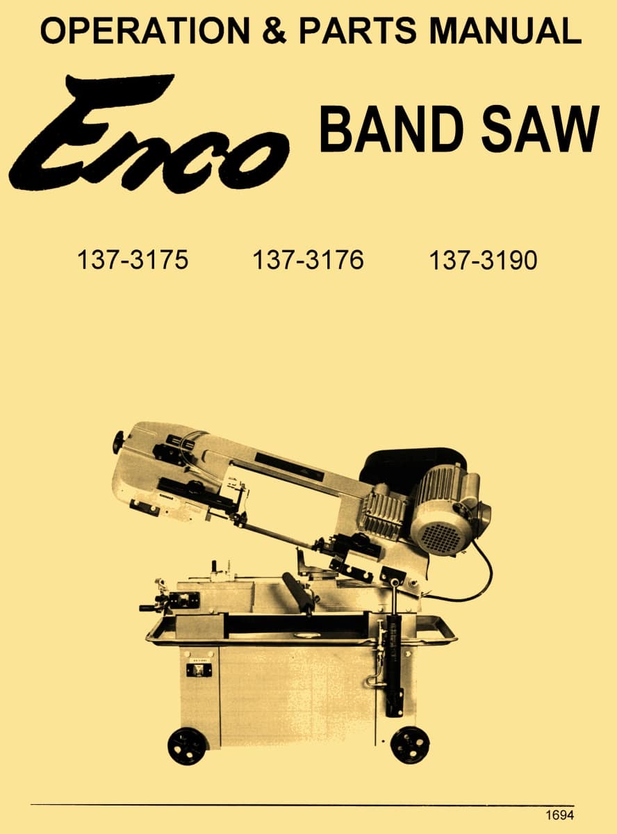 Enco 7″ x 12″ Horizontal Metal Band Saw 137-3175, 137-3176,137-3190 Owner’s Instruction Service Parts Manual