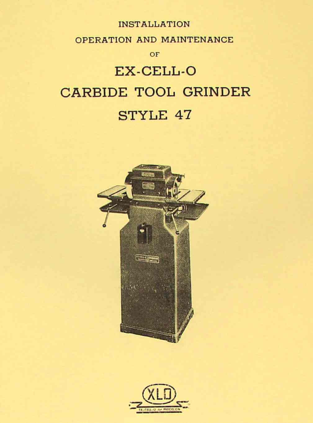 This is a reproduction, not a photocopy, of an original Ex-Cell-O Style 47 Carbide Tool Grinder Installation, Operation, and Maintenance Manual. This manual includes information on installation, operation, lubrication, and adjustments. It also contains a hints and tips section on using this grinder with proper grinding techniques.