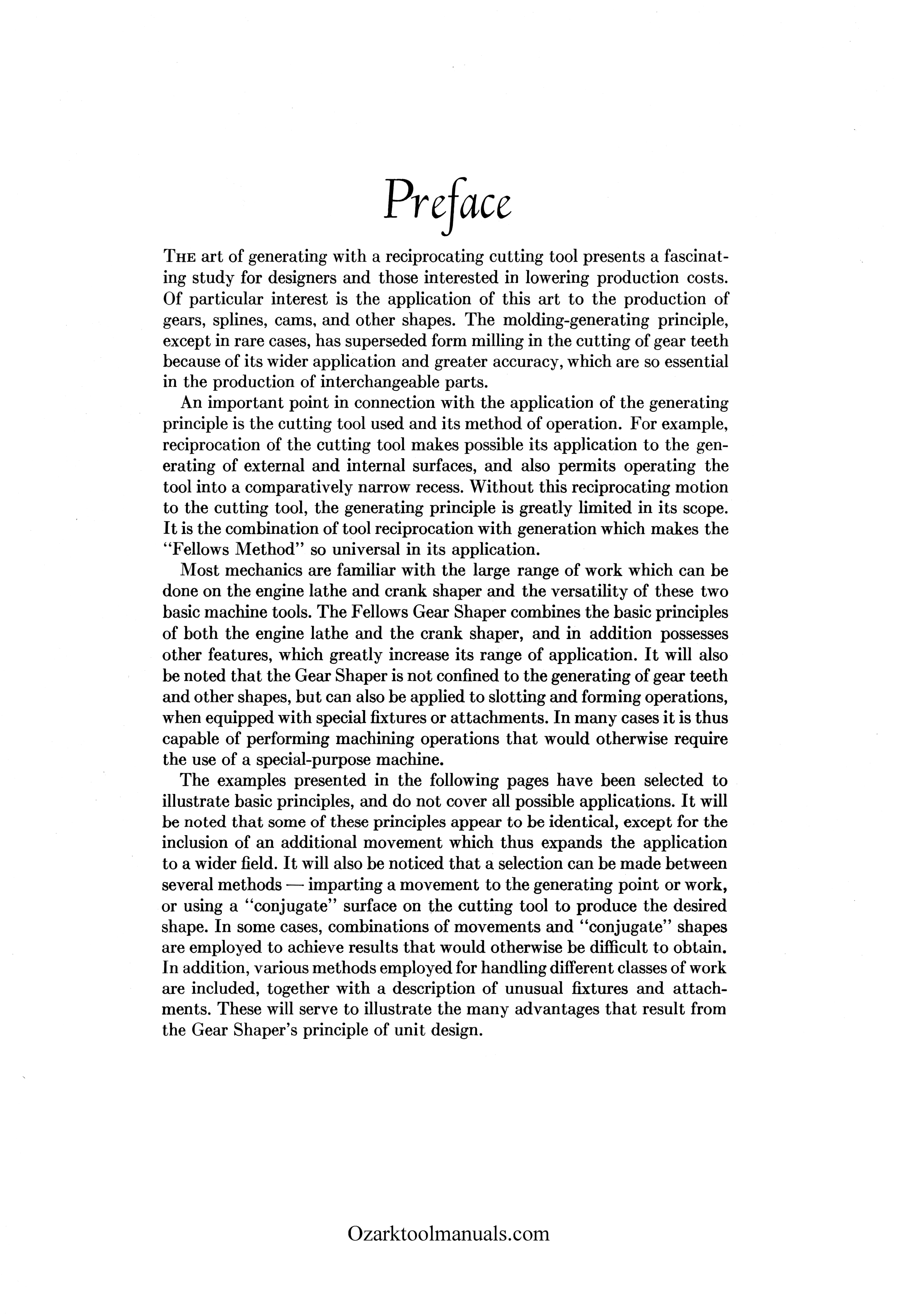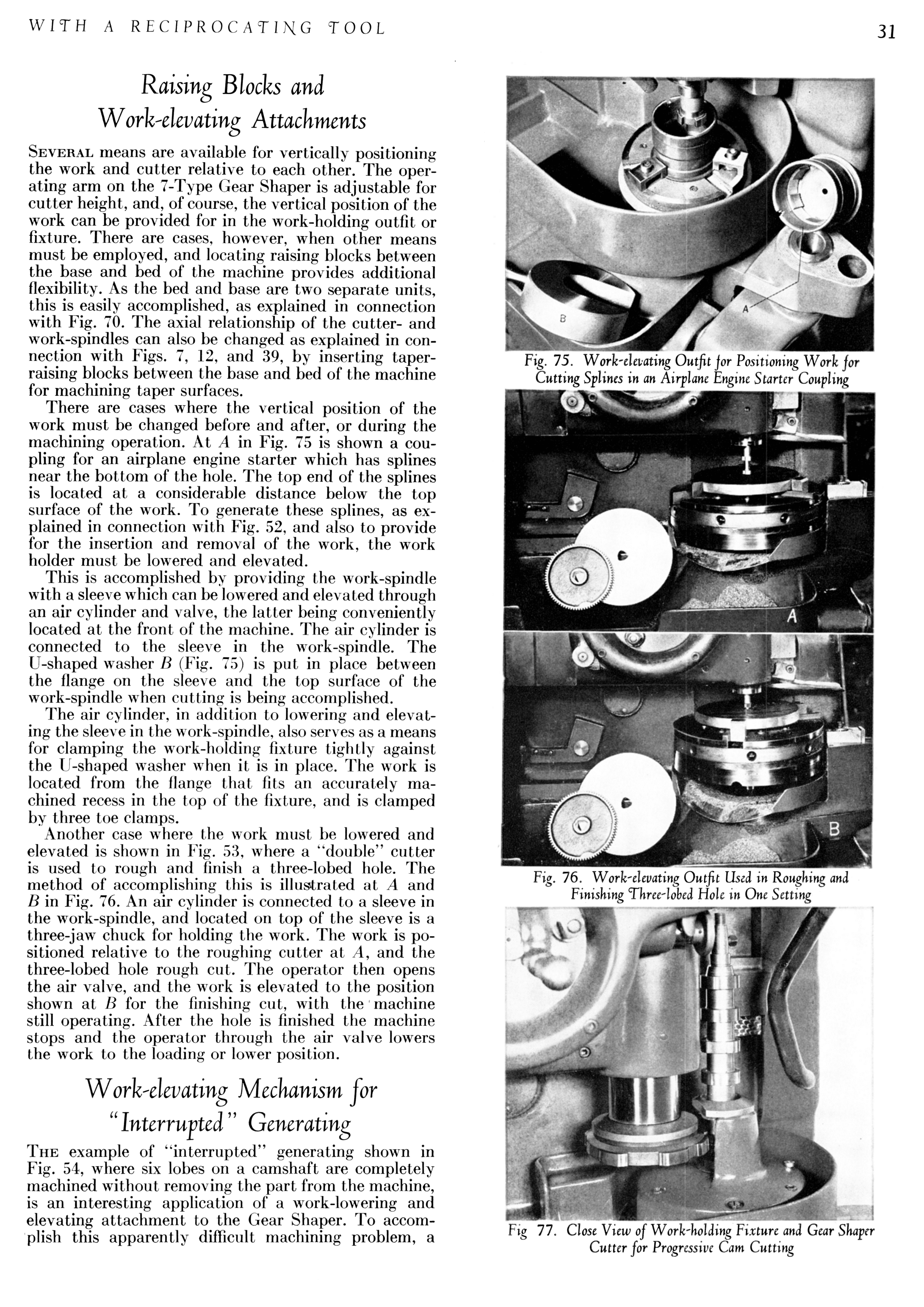 The book does cover Fellow gear shapers. It covers some of the features and attachments. Most of the attachments and devices apply to the No. 7 and No. 7A Fellows Gear Shapers, but all types of Gear Shapers include the same general features. A lot of different “Tripping” device attachments are show and explained on how to set up.