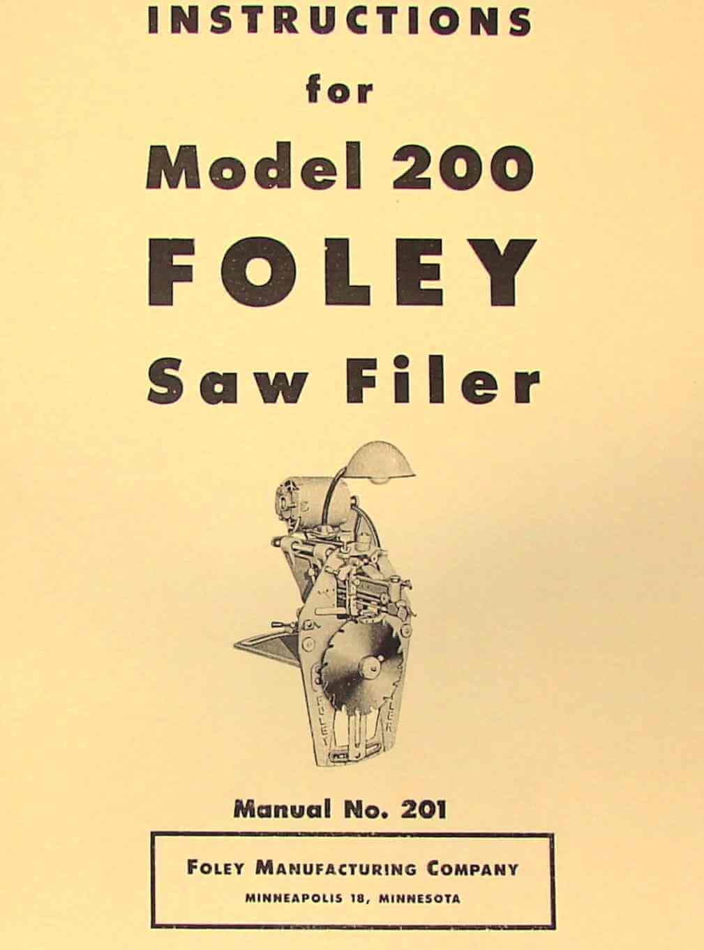This is a reproduction, not a photocopy, of an original Foley 200 Saw Filer Operating, Service, and Parts Manual. This manual contains information set up, lubrication, operating instructions, and maintenance. It also covers lots of different set ups for a variety of different saws blades.