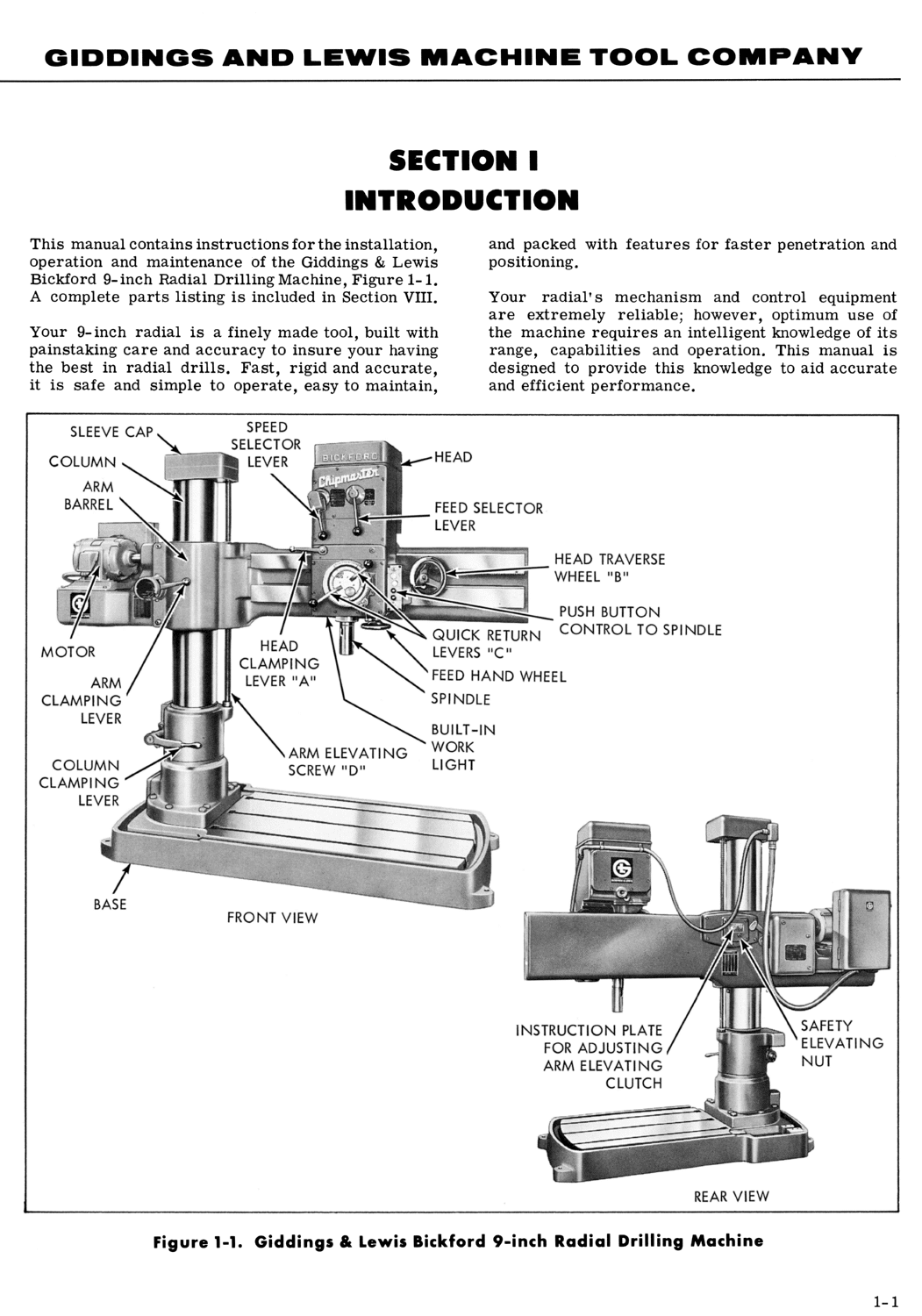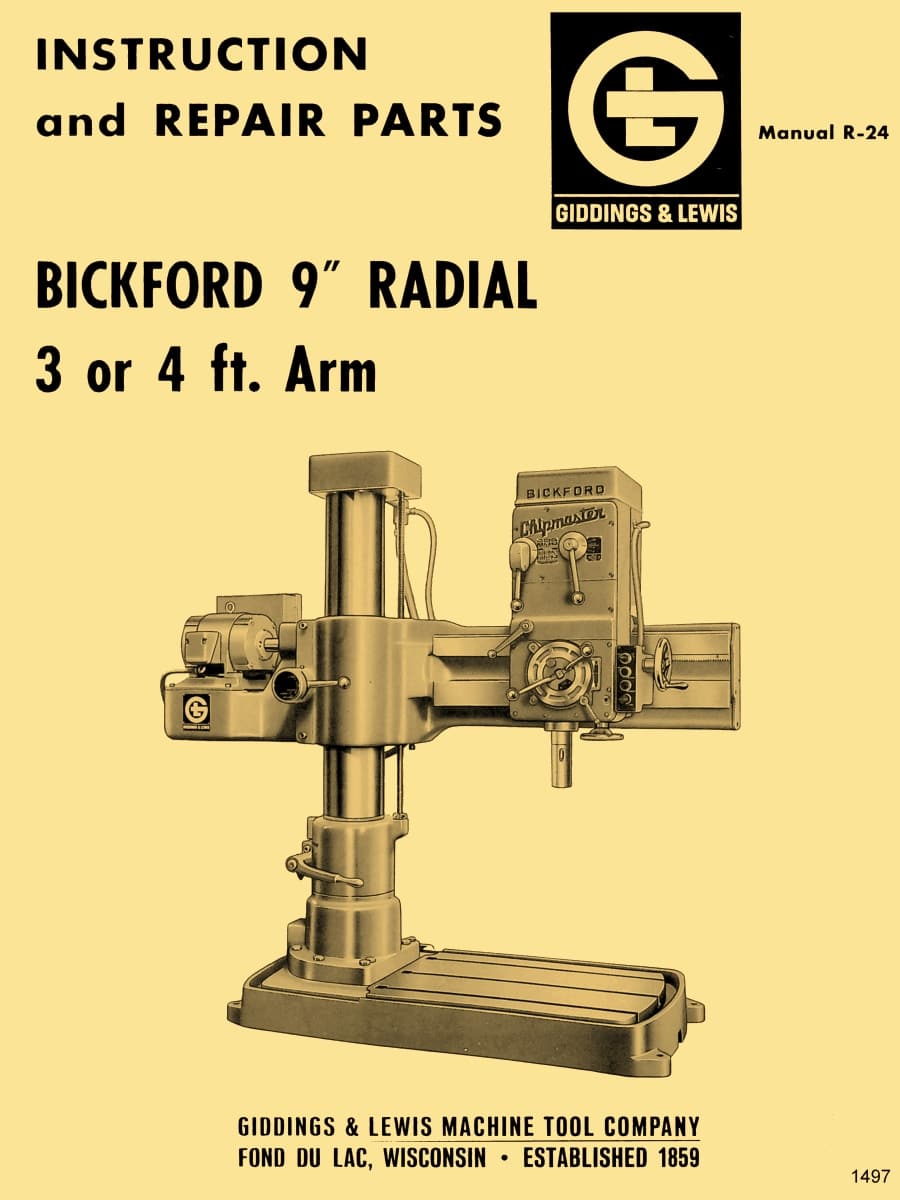 This is a reproduction, not a photocopy, of an original Gidding & Lewis Bickford Chipmaster 9″ Radial Drill with 3 or 4-foot Arm Operation and Parts Manual. This manual covers installation and lifting instructions. Instructions for laying out the foundation. The manual contains really good operating instructions with images. How to adjust the different sets of clutches on this radial drill are covered with instructions. The parts diagrams are on large 11″ x 17″ foldouts with parts list and descriptions. If you have this radial drill you need this manual.