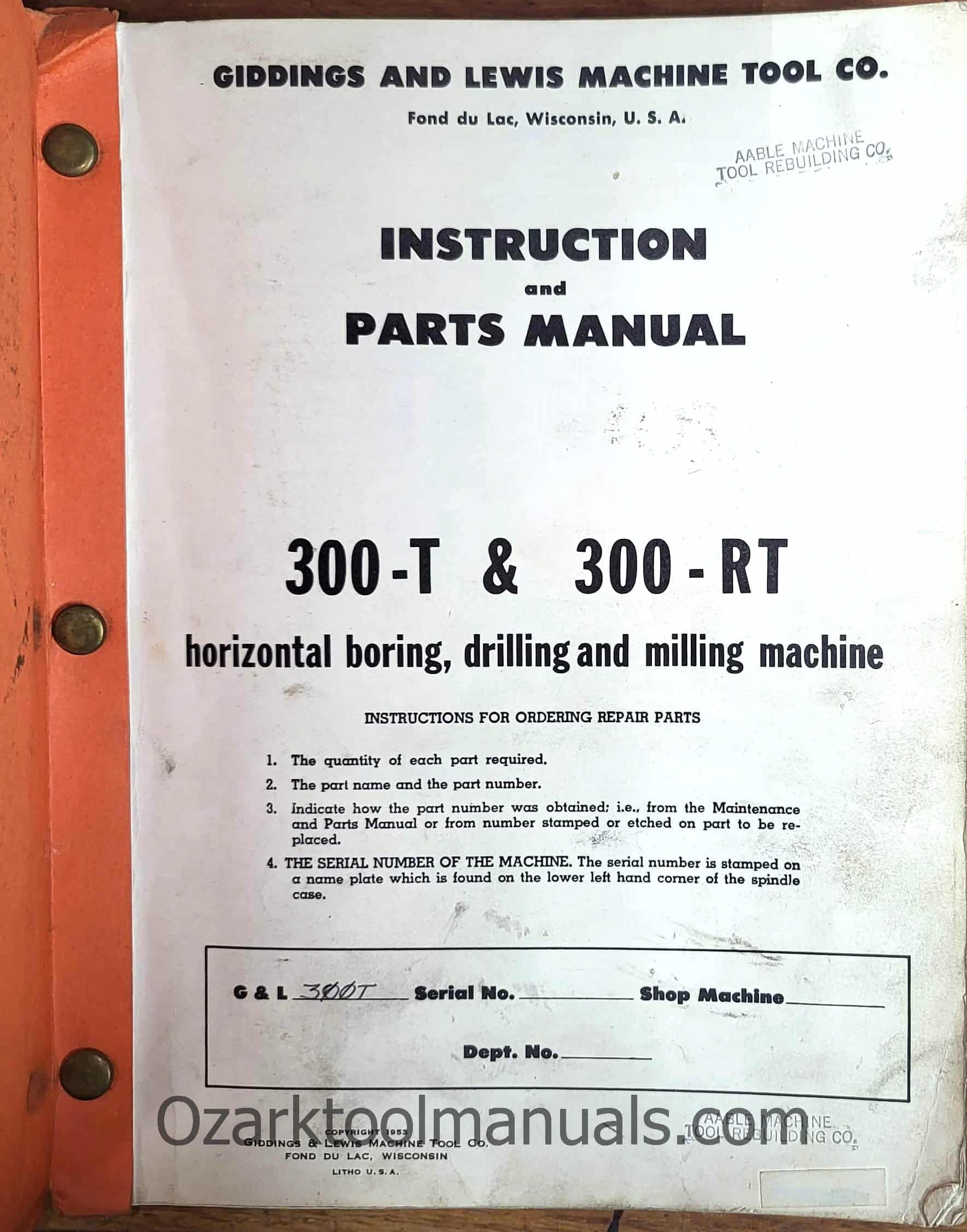 Giddings & Lewis 300-T 300-RT Horizontal Boring Milling Machine Operator Instructions Parts Manual