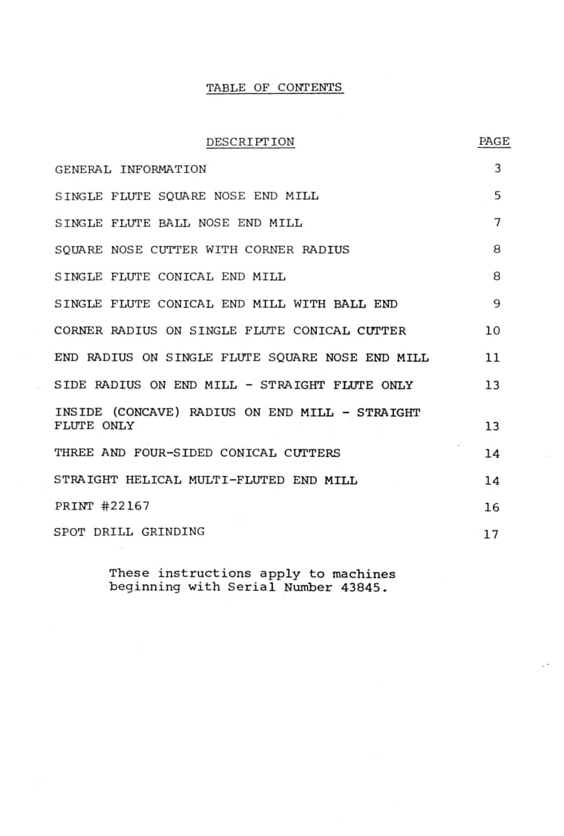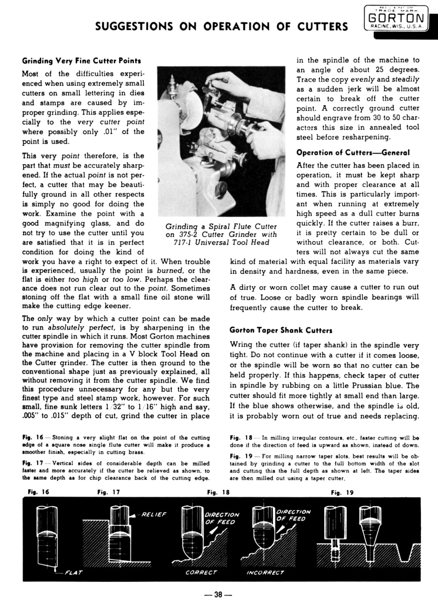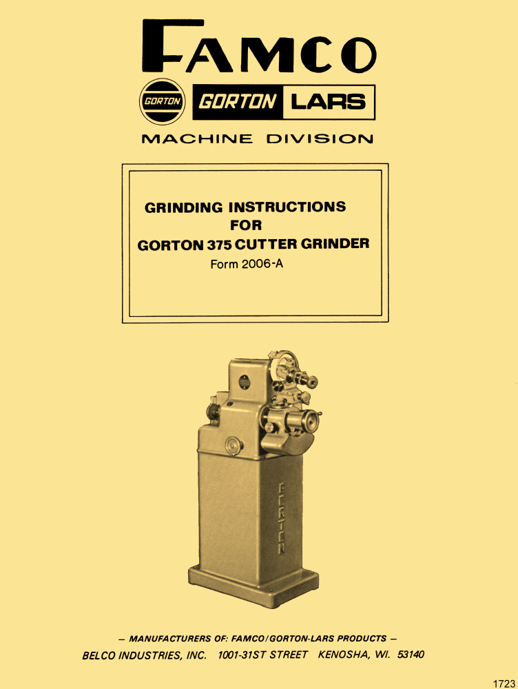 This is a reproduction, not a photocopy, of an original Gorton 375 Cutter Grinder Instructions and Parts Manual. This manual covers how to properly operate and set up this grinder. The manual covers single‑flute square‑nose and ball‑nose end mills, cutters with corner radii, and several types of conical end mills—including versions with ball ends and those requiring corner‑radius work. It also includes instructions for adding end radii and side radii on straight‑flute mills, as well as creating inside (concave) radii. Beyond single‑flute tools, it addresses three‑ and four‑sided conical cutters and straight‑helical multi‑fluted end mills. The final sections reference a specific print number and provide guidance on spot‑drill grinding.