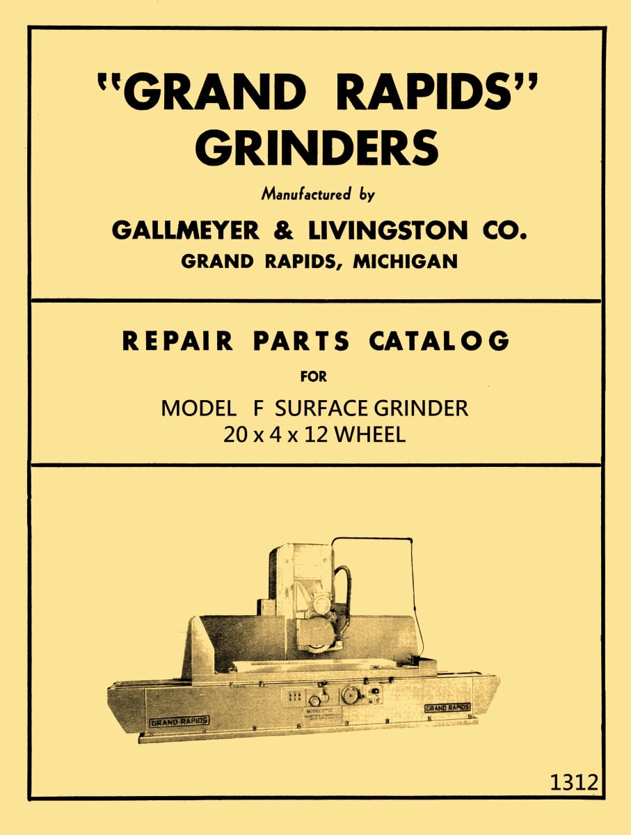 This is a reproduction of an original Grand Rapids Hydraulic Feed Surface Grinder Model F Parts Manual manufactured by Gallmeyer and Livingston Company with a 20″ x 4″ x 12″ recessed wheel. These models had 16″, 18″, 20″ tables. This Grand Rapids surface grinder manual contains cross-sectional view diagrams of the parts with parts list.