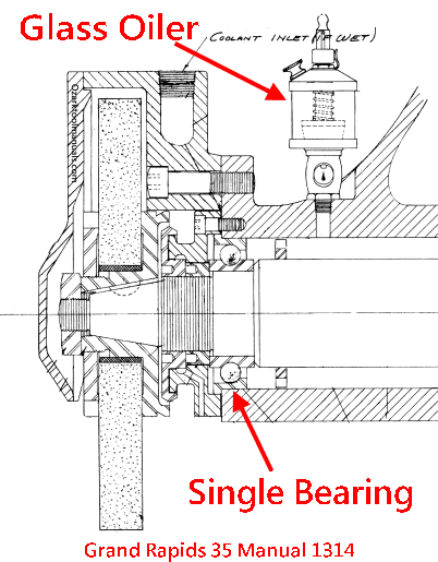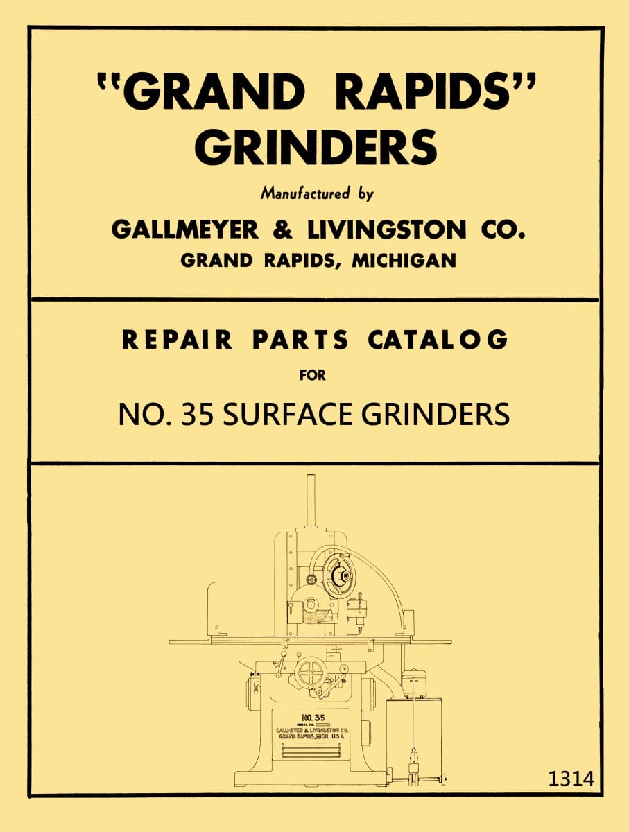 This is a reproduction of an original Grand Rapids Hydraulic Feed Surface Grinder Older Model 35 Parts Manual manufactured by Gallmeyer and Livingston Company. This model has a single bearing on the front of the main spindle, and it does have an oil glass on top. We have a manual for the newer version that has double bearings with no glass oiler on top as well. This Grand Rapids surface grinder manual contains cross-sectional view diagrams of the parts with parts list.