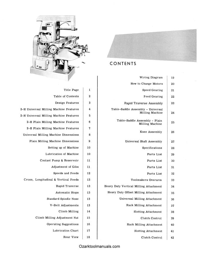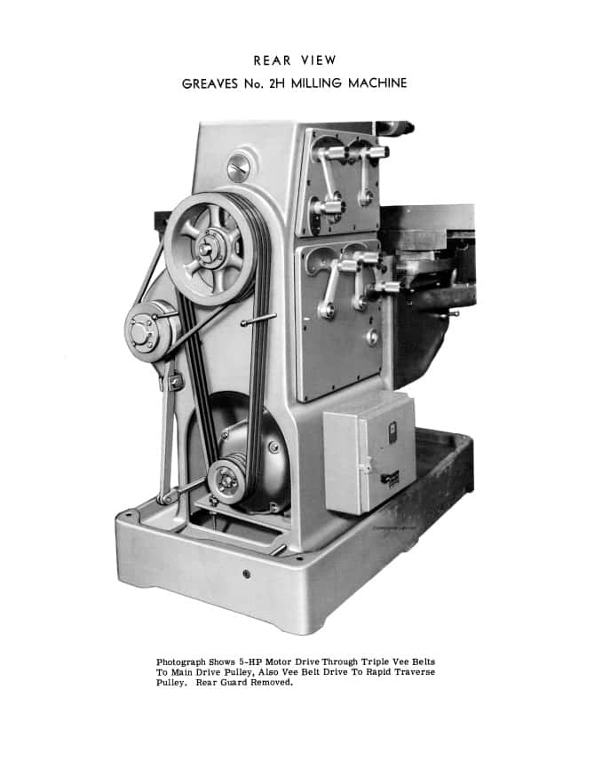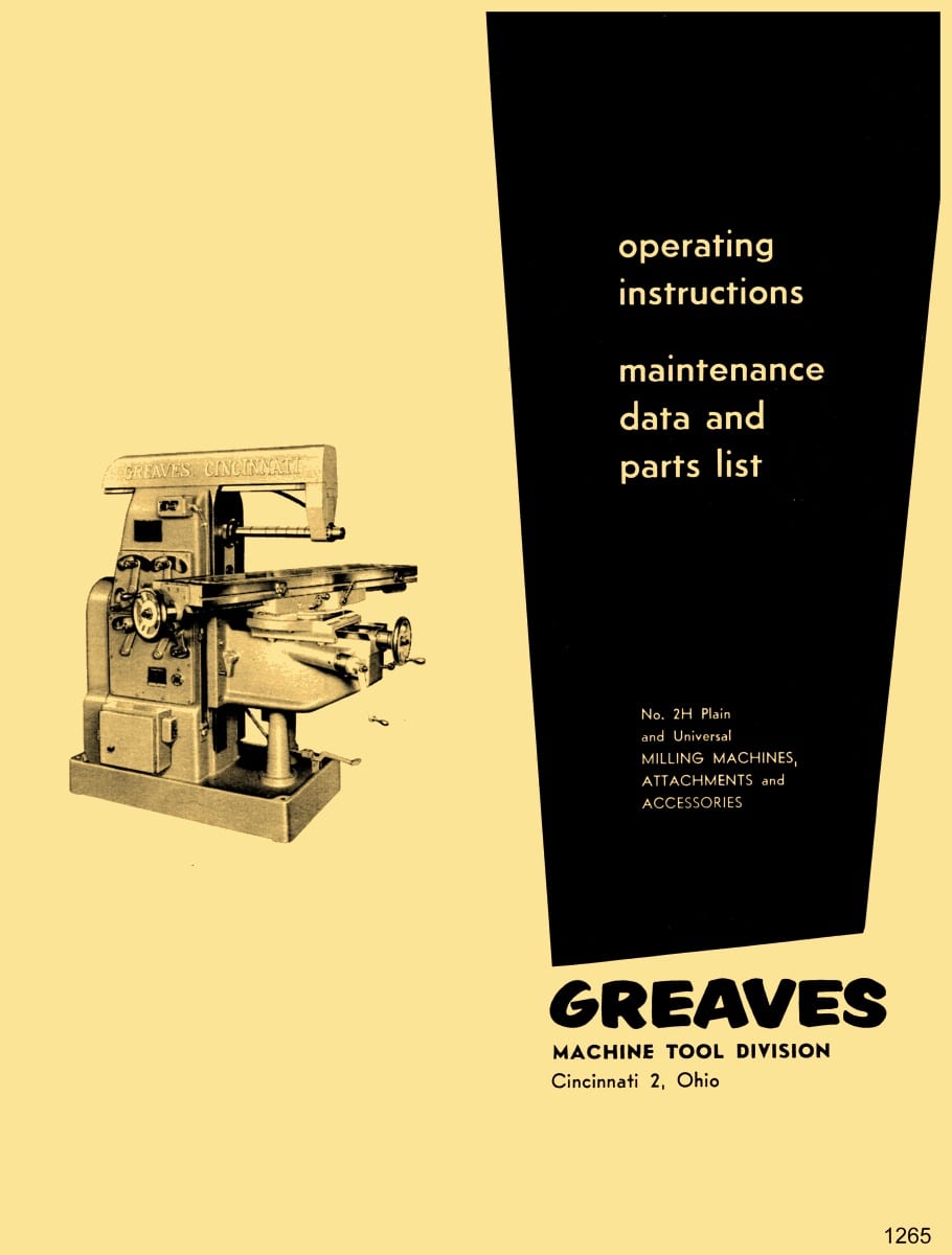 This is a reproduction, not a photocopy, of an original Greaves Cincinnati 2H Plain and Universal Horizontal Milling Machine Operating Instructions, Maintenance Data, and Parts List Manual. This mill manual contains information about the mill specifications, installation instructions, lubricating instructions, and proper operating instructions. The manual includes details on how to make adjustments like on how to remove backlash on the longitudinal feed, and a wiring diagram. It also has cross-sectional view diagrams of all the parts with parts descriptions, and covers details on many of the attachments and accessories made for these Greaves Cincinnati 2H milling machines.