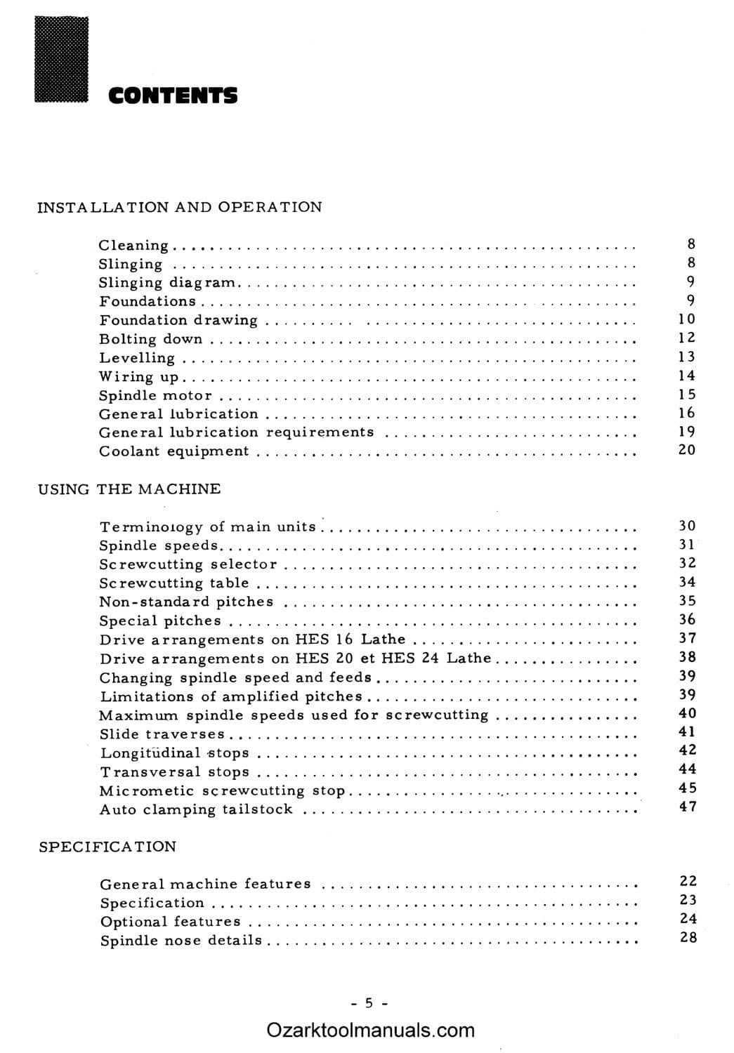 This manual contains information about the metal lathe specifications and dimensions. It also covers moving, setting up, and proper lubrication instructions. The manual covers a lot of maintenance, adjustments, and repair information. It includes instructions for adjusting the spindle bearings, leadscrew overload, and more. The manual also contains the thread chart for standard and metric threads for these HES metal lathes.