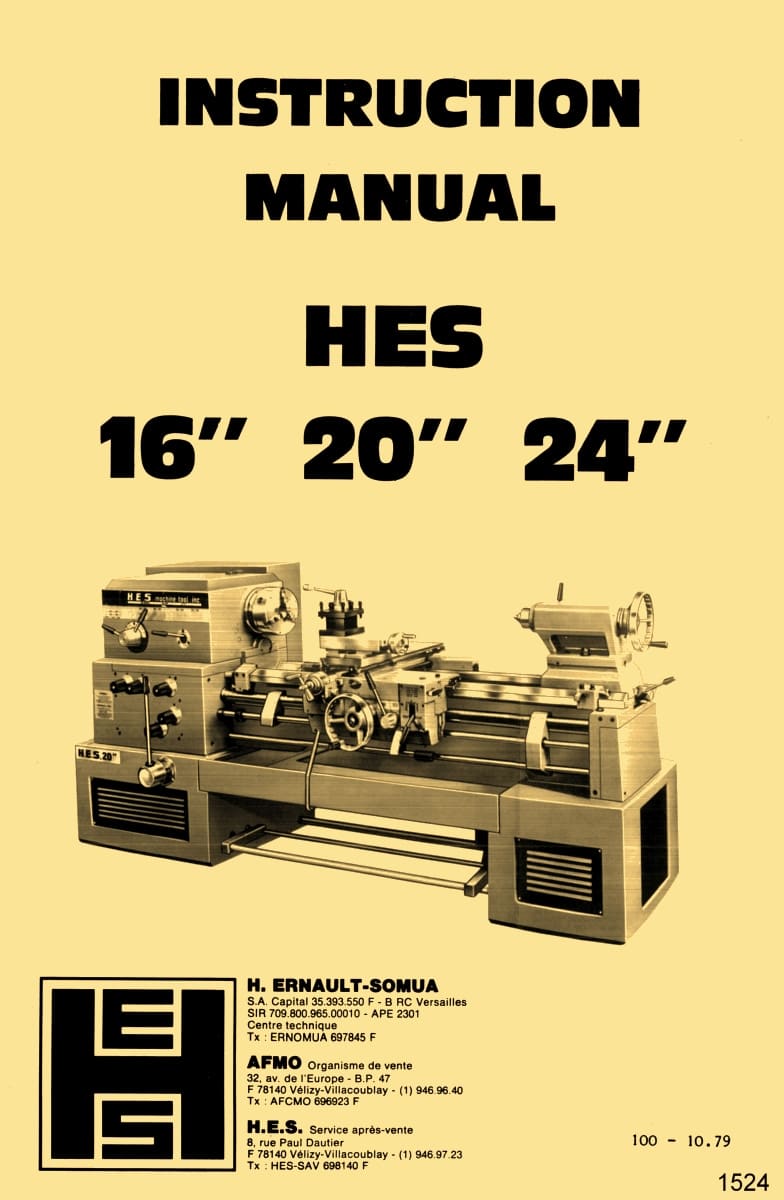 This is a reproduction, not a photocopy, of an original H. Ernault-Somua (HES) 16″ – 20″ -24″ Engine Metal Lathes Operator Owner Instructions Manual. These metal lathes were made in France.