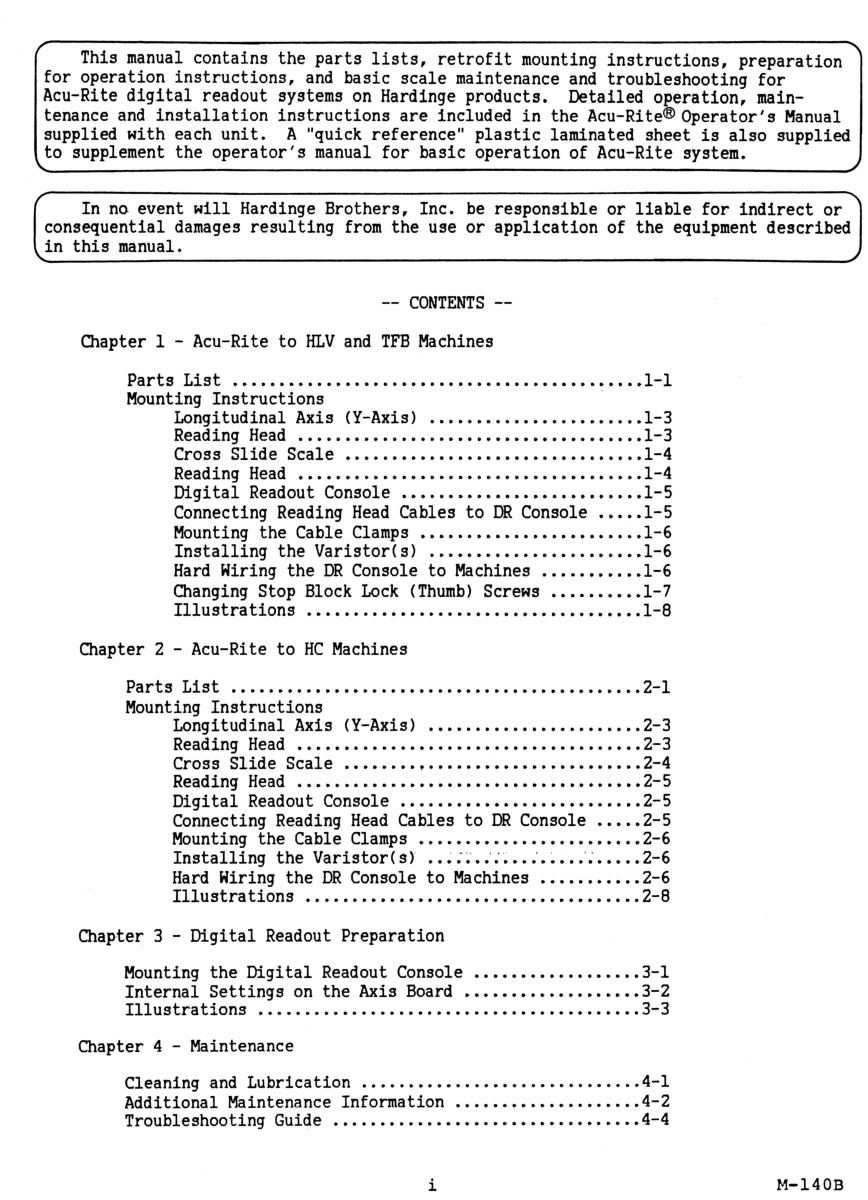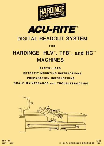 This is a reproduction, not a photocopy, of an original Hardinge Acu-Rite Digital Readout (DRO) System for Hardinge HLV, TFB, and HC metal lathes parts list, retrofit mounting instructions, preparation instructions, scale maintenance, and troubleshooting Manual.