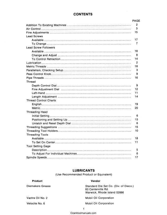 This is a reproduction, not a photocopy, of an original Hardinge Operator’s Manual for Automatic Threading Unit on Hardinge AHC Super-Precision Automatic Chucker and Bar Machine printed in 1978. This manual contains information about lubrication, air control adjustments, how to set the machine and tools, changing and adjusting the lead screw follower, different Hardinge thread tooling, and thread control charts for English and Metric threads. You can see the contents pictured above for this Hardinge manual.