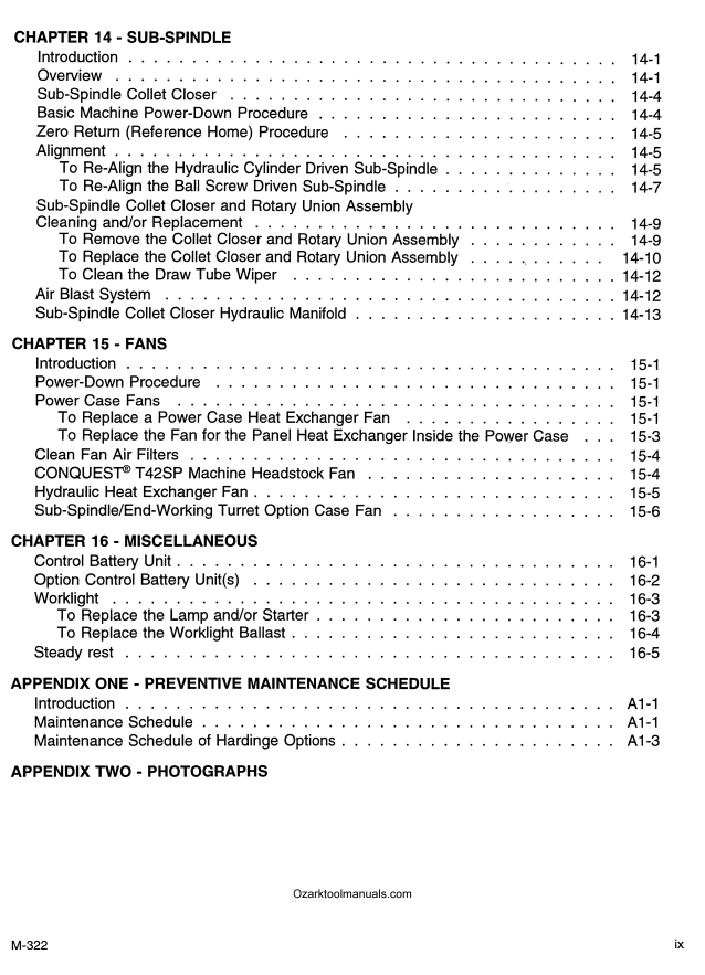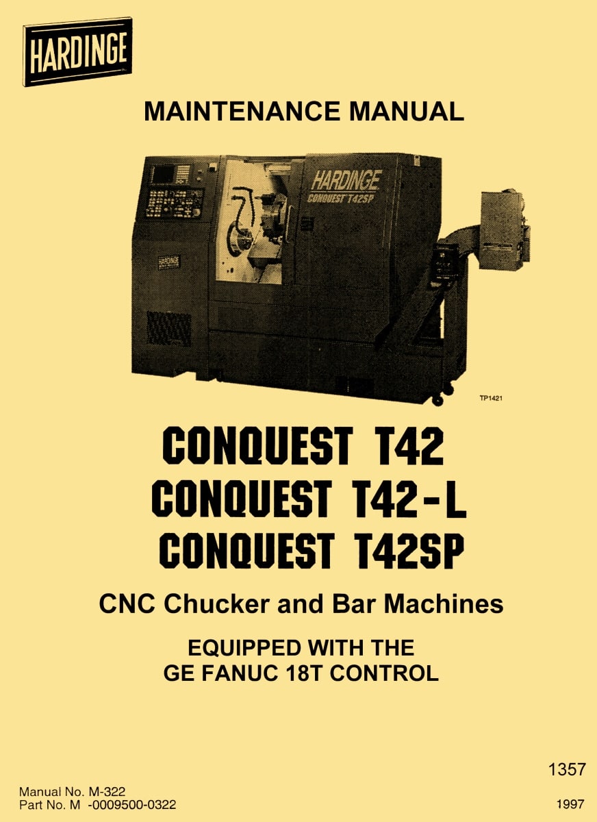 This is a reproduction, not a photocopy, of a Hardinge Conquest CNC Chucker Metal Lathe Service and Maintenance Manual. This maintenance manual Hardinge Conquest T42, Conquest T42-L, and Conquest T42SP CNC lathes.