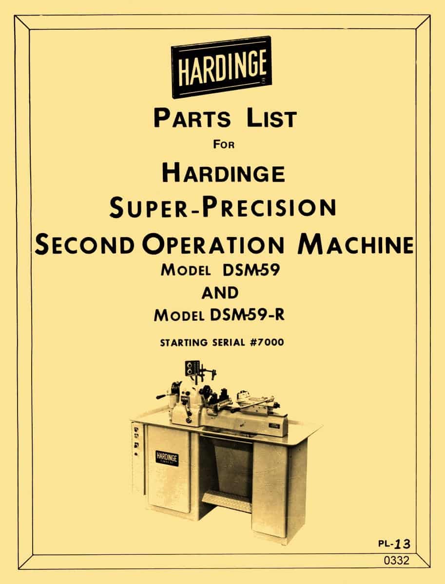 This is a reproduction, not a photocopy, of an original Hardinge DSM-59 and DSM59-R Super-Precision Bar and Second Operation Machines Parts Manual with serial numbers starting at 7,000. This manual contains cross-sectional parts diagrams for this machine. See index below.