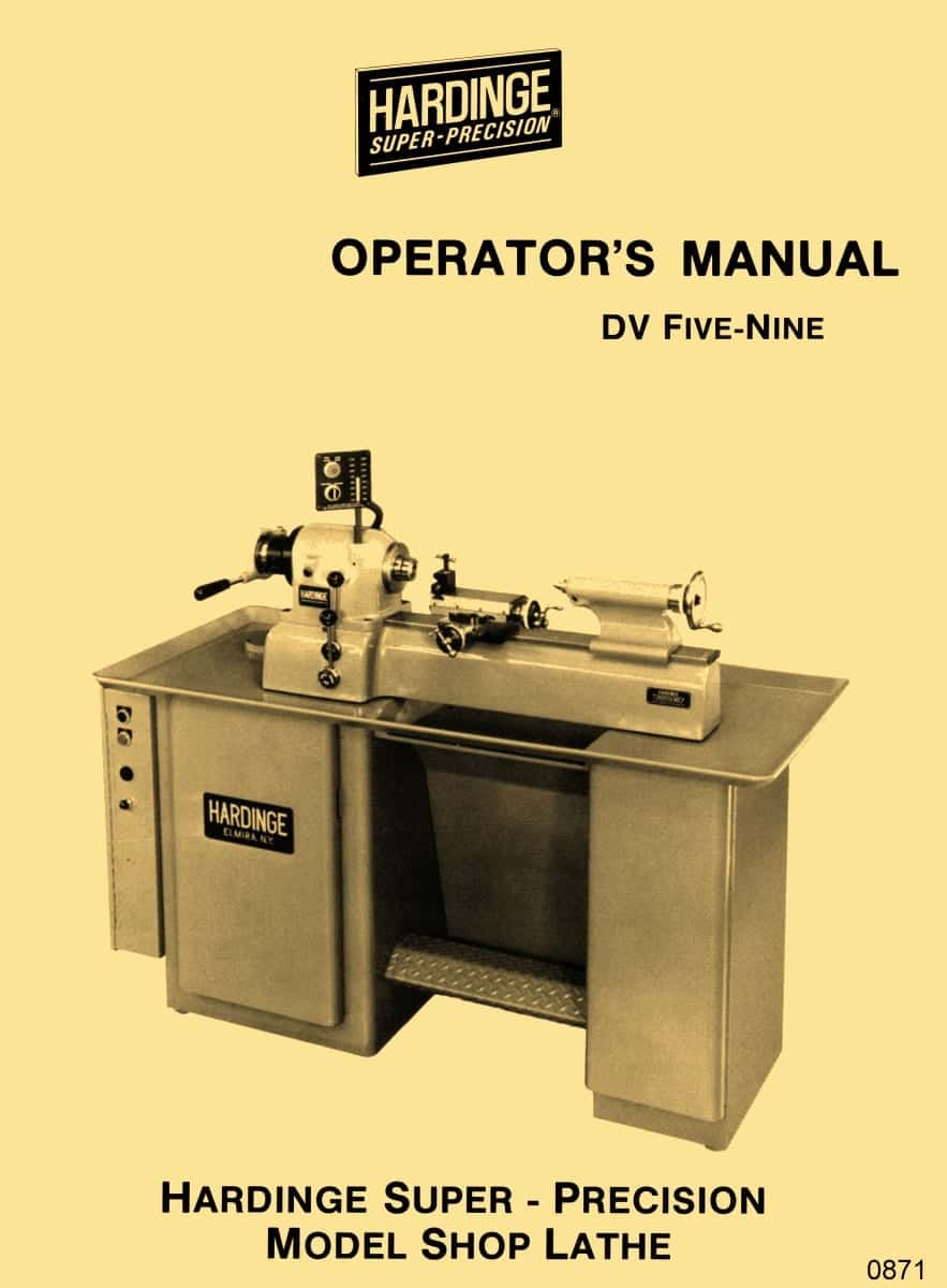 This is a reproduction, not a photocopy, of an original Hardinge Model DV-59 Metal Lathe Operator’s Manual. This manual contains information on lubrication, operation instructions, adjustments, removing the drive belt, collet closer removal, and maintenance.