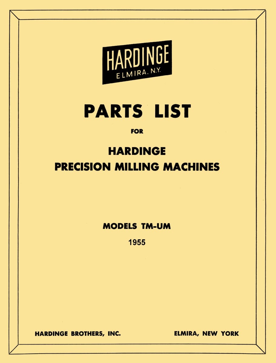 This is a reproduction, not a photocopy, of an original Hardinge Super-Precision Horizontal Milling Machines model TM and model UM parts manual. This manual covers the original models in the 1950s that are below serial number 32273 . The serial number is stamped on the front of the table. We have the parts manual for newer Hardinge milling machine models with higher serial numbers at the following link: