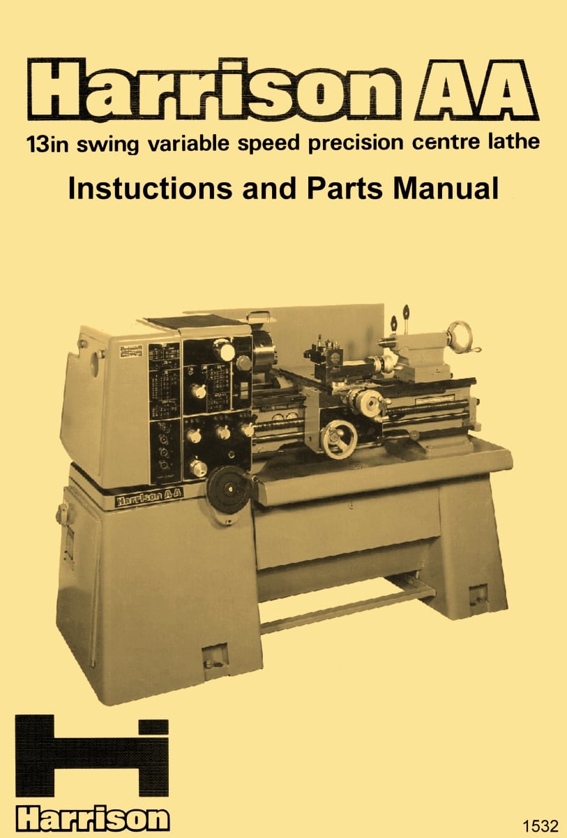 This is a reproduction, not a photocopy, of an original Harrison AA 13″ Metal Lathe Instructions and Parts manual. This manual contains information about the lathe specifications, installation instructions, proper lubricating instructions, adjustments, maintenance, and proper operating procedures. The manual also contains electrical wiring diagrams, and explosive view diagrams of all the parts for this Harrison AA lathe.