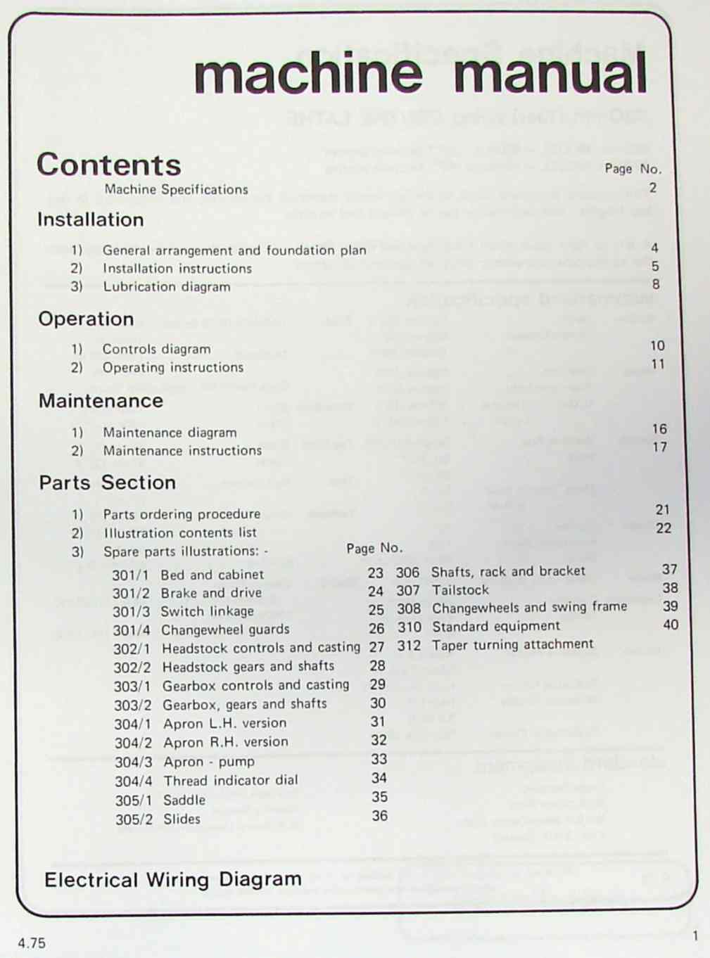 This is a reproduction, not a photocopy, of an original Harrison M300 13″ Metal Lathe Instructions and Parts manual. This manual contains 19 pages of information on set up, lubrication, maintenance, adjustments, and controls as well 27 pages of parts list and diagrams. The parts diagrams include steady rest, taper attachment, and turret. It also contains electrical diagrams.