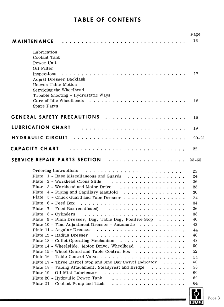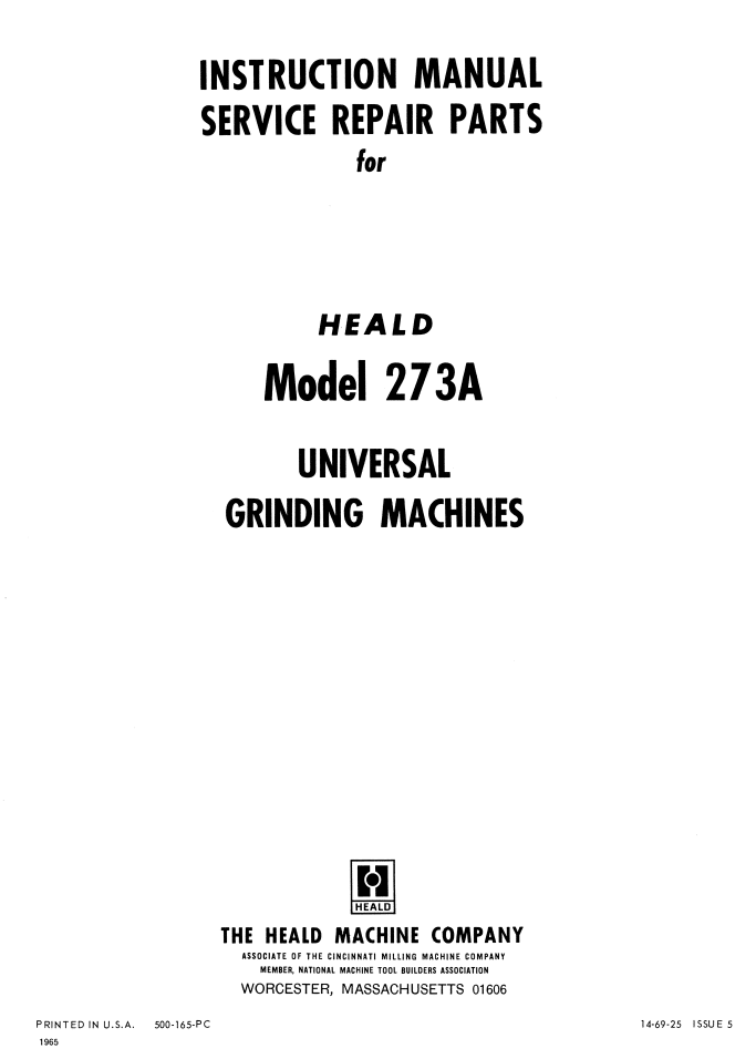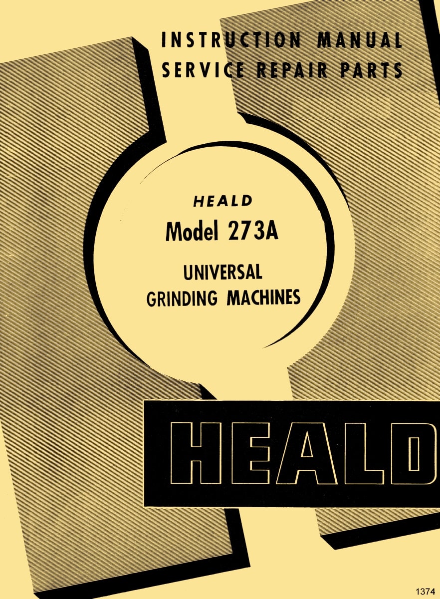 This is a reproduction, not a photocopy, of Heald Model 273A Universal Grinding Machines Instruction Service Repair Parts Manual. This manual contains information about the grinder specifications and installation instructions. The manual covers proper lubrication and operating procedures. It contains a hydraulics and electrical wiring diagram. The manual also has explosive view diagrams of all the parts with parts list and descriptions for these Heald 273A ID grinders.
