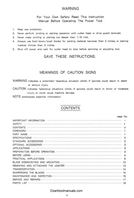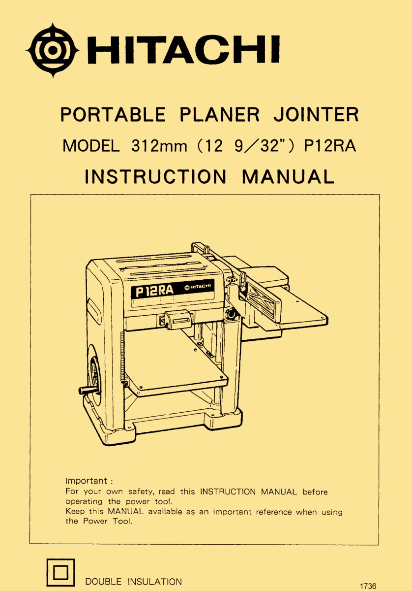 This is a reproduction, not a photocopy, of an original Hitachi P12RA 12-9/32″ Wood Planer and Jointer instructions and parts manual. This manual contains safety, installation, and assembly instructions. The manual covers how to operate the various parts of this planer properly. It shows how to make adjustments to the blades and perform maintenance. There are instructions for changing and mounting the knives and blades properly. This Hitachi manual has a complete set of clear explosive view diagrams of all the parts with parts lists and descriptions for this Hitachi planer/jointer combo.