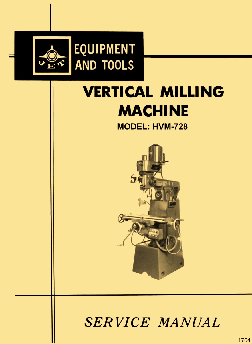 This is a reproduction, not a photocopy, of an original JET Tools HVM-728 Vertical and Horizontal Milling Machine Instructions and Parts Manual for Stock No. 690047. This manual has the mill specifications, general operating instructions, and lubricating instructions. The JET manual contains wiring diagrams and cross-sectional view diagrams of the parts. There are parts list with descriptions, but it appears that there was a certain set of parts that weren’t replaceable. It seems that they have left those numbers off with the descriptions, but they are shown in the diagrams. The manual is complete, because I have two copies that are the same, and don’t seem to have any missing pages.