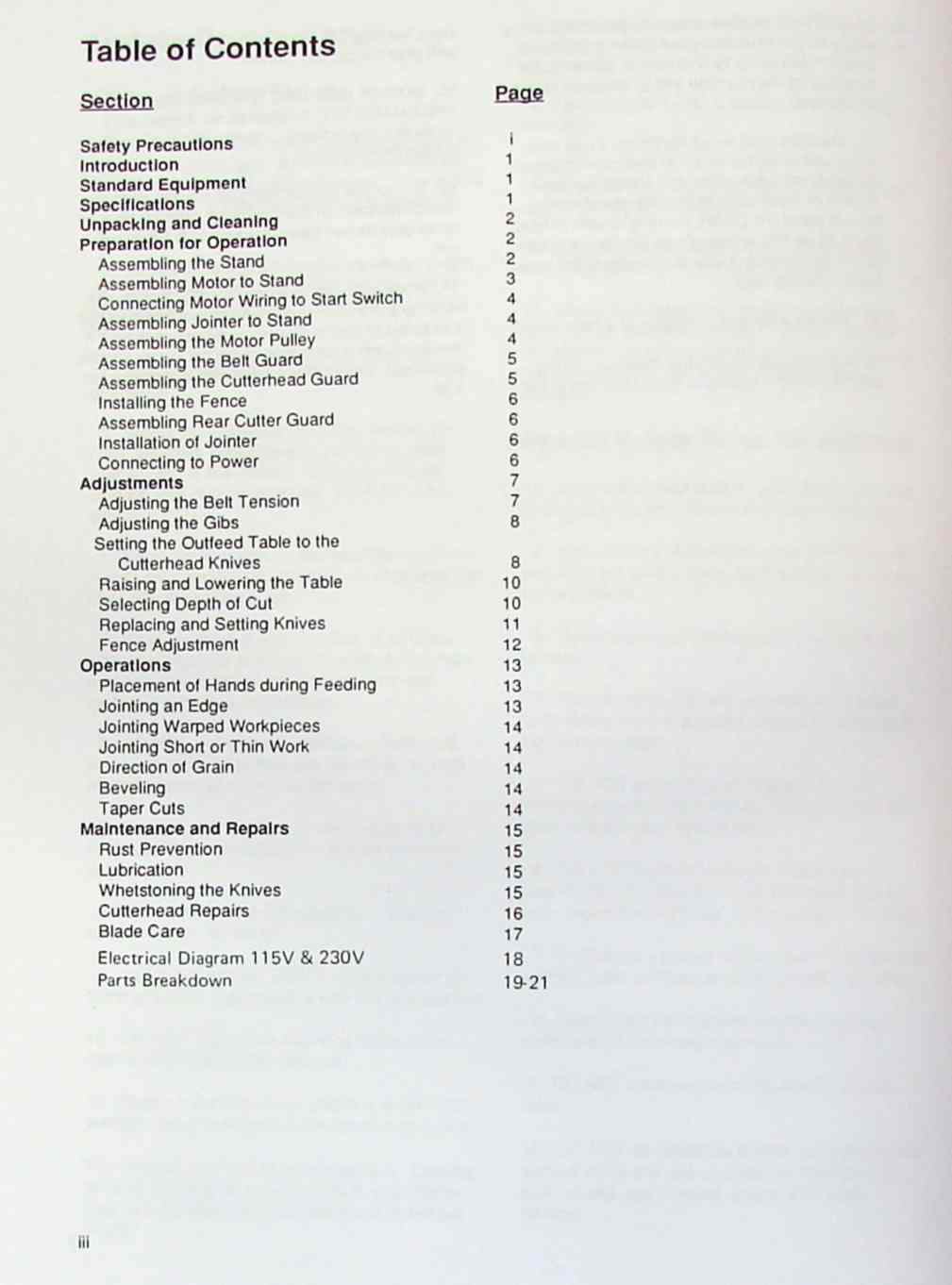 This is a reproduction, not a photocopy, of an original JET JJ-4 4-inch Wood Jointer Instructions and Parts Manual. This manual contains general safety instructions, operating instructions, assembly instructions, adjustments, maintenance, lubrication, and a complete set of exploded view diagrams of the parts with description. Please read index below.