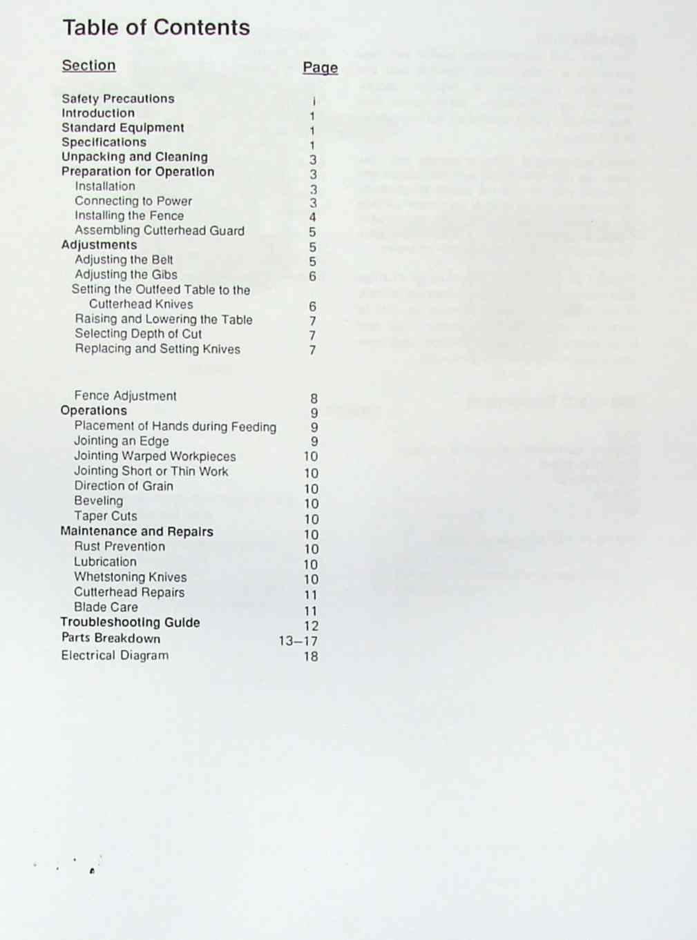 This is a reproduction, not a photocopy, of an original JET/Asian JJ-8CS 8″ Wood Jointer Instructions and Parts Manual. This manual contains information on lubrication, maintenance, adjustments, operations, and controls. It also contains exploded view diagrams of all the parts for the machine. Please read contents below.