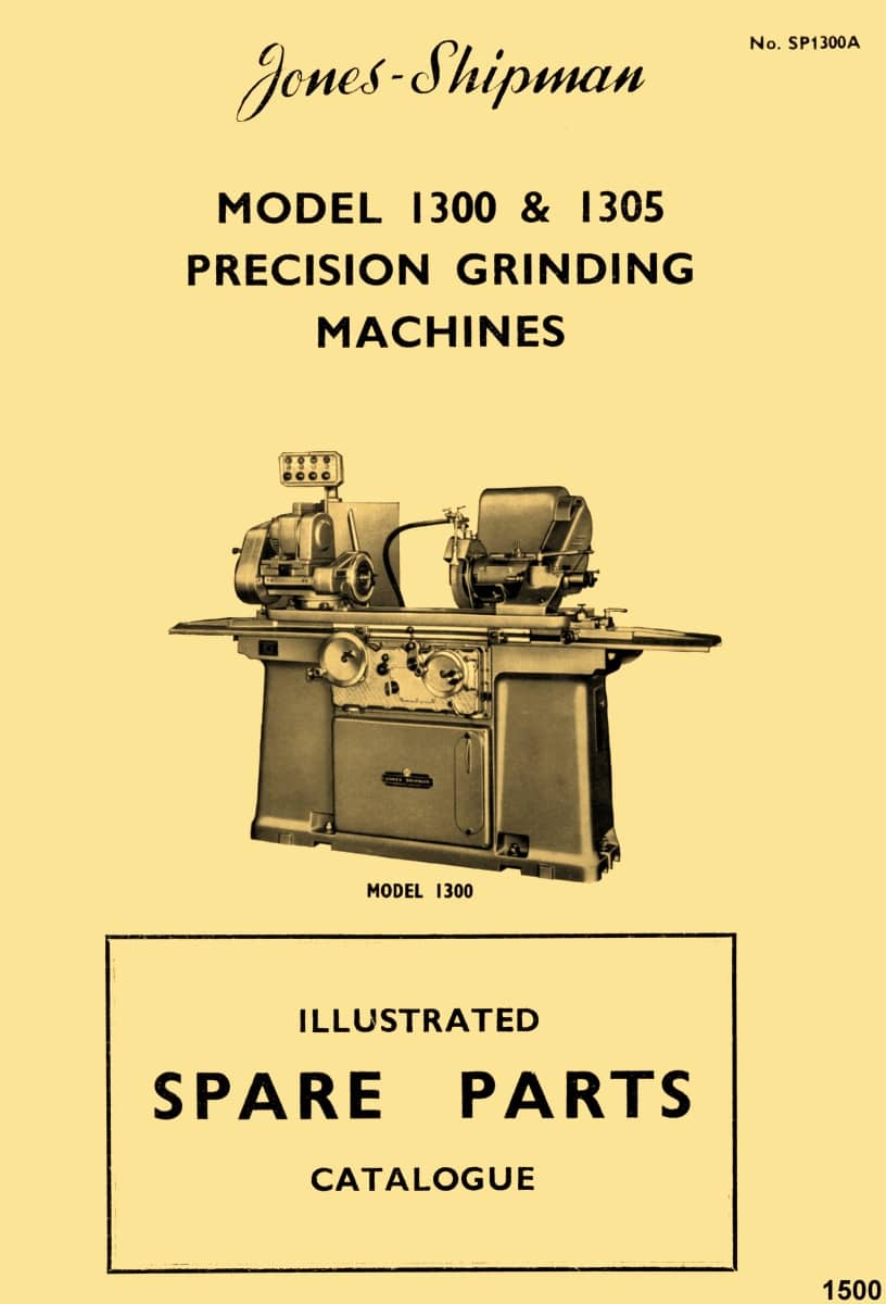 This is a reproduction, not a photocopy, of an original Jones & Shipman Models 1300 and 1305 Toolroom Surface Grinder Parts Manual. This manual contains pictorial views of the parts laid out in the order they go with parts list and descriptions. Please see the index above for these Jones & Shipman grinders.