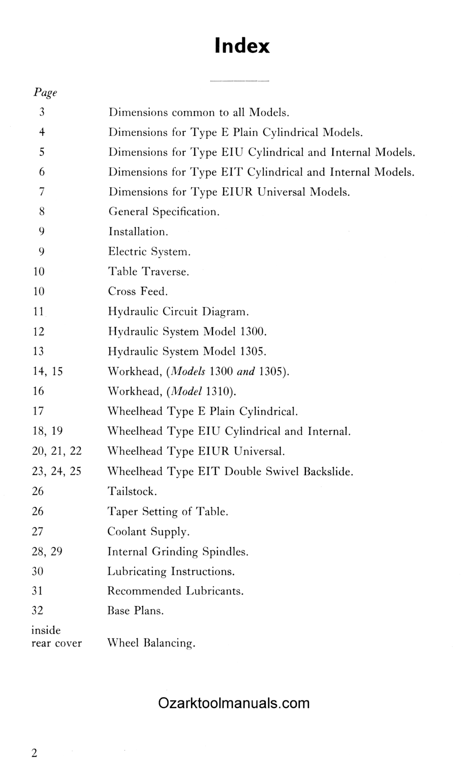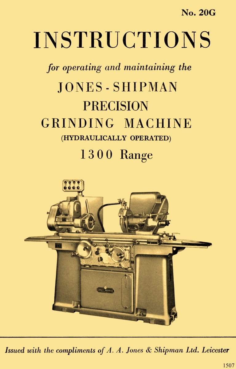 This is a reproduction, not a photocopy, of an original Jones & Shipman Models 1300 Series Toolroom Surface Grinders Operating Instructions and Maintenance Manual. This manual contains information about the specifications of the different models. It covers installation and setup instructions. This instructions manual covers proper operating instructions. For the hydraulic models, it has a hydraulic circuit diagram with proper lubricating instructions. This manual also covers maintenance and adjustment instructions for various belts and spindle bearings. Please see image of index above.