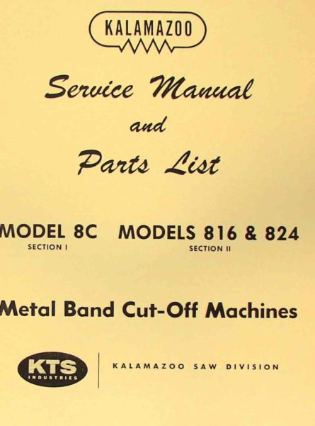 This is a reproduction, not a photocopy, of an original Kalamazoo Model 8C, 816, 824 Series Metal Band Cut-Off Machines Service and Parts Manual. This manual contains information on how to install the blade, how to set blade speed, pressure and the guides, lubrication instructions, and parts diagrams with parts numbers and descriptions. The back page includes information on the specifications of the 8C, 816, 824 series and information on what type of blades and speeds to use on different materials.