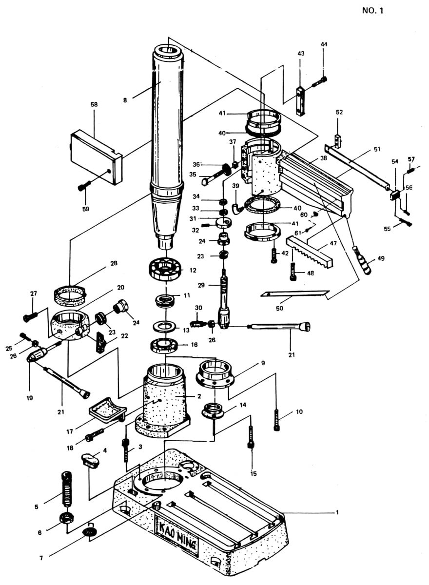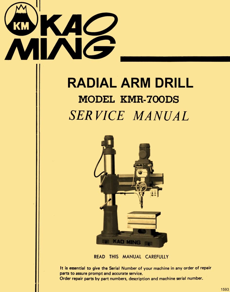 This is a reproduction, not a photocopy, of an original KAO MING KMR-700DS Radial Drill Owner’s, Operator’s and Parts Manual this drill was sold as a Supermax as well as other brands when imported. This manual contains the radial drill specifications, safety instructions, operating instructions, and maintenance. The manual also has proper lubrication instructions and wiring diagrams. The manual includes a complete set of explosive view diagrams of all the parts with parts list and descriptions for this KMS-700DS Radial Drill.