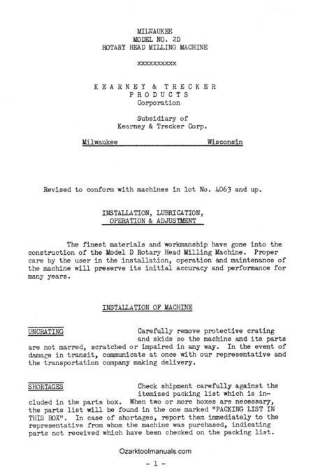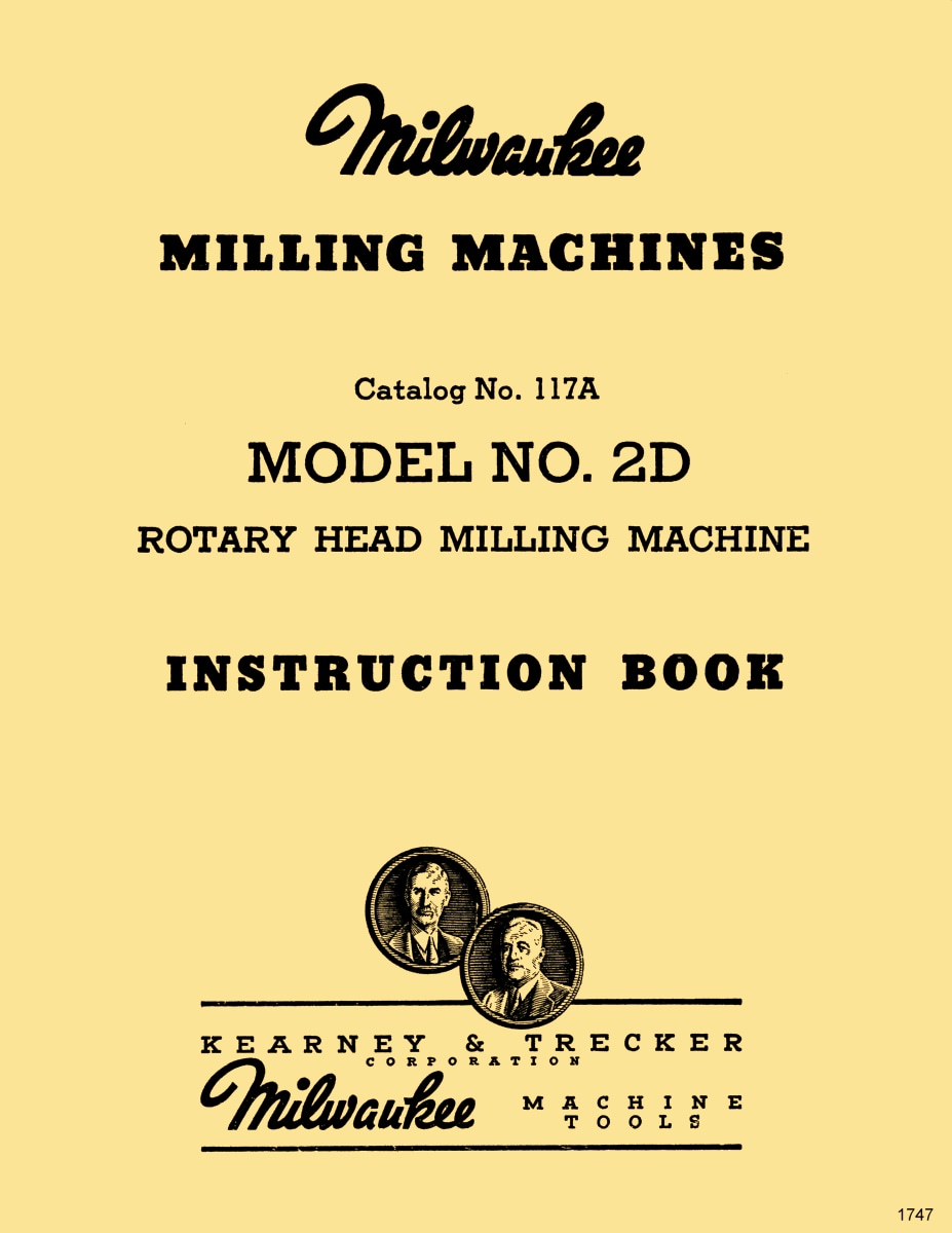 Kearney & Trecker Milwaukee 2D Rotary Head Vertical Mill Instruction Operator Manual