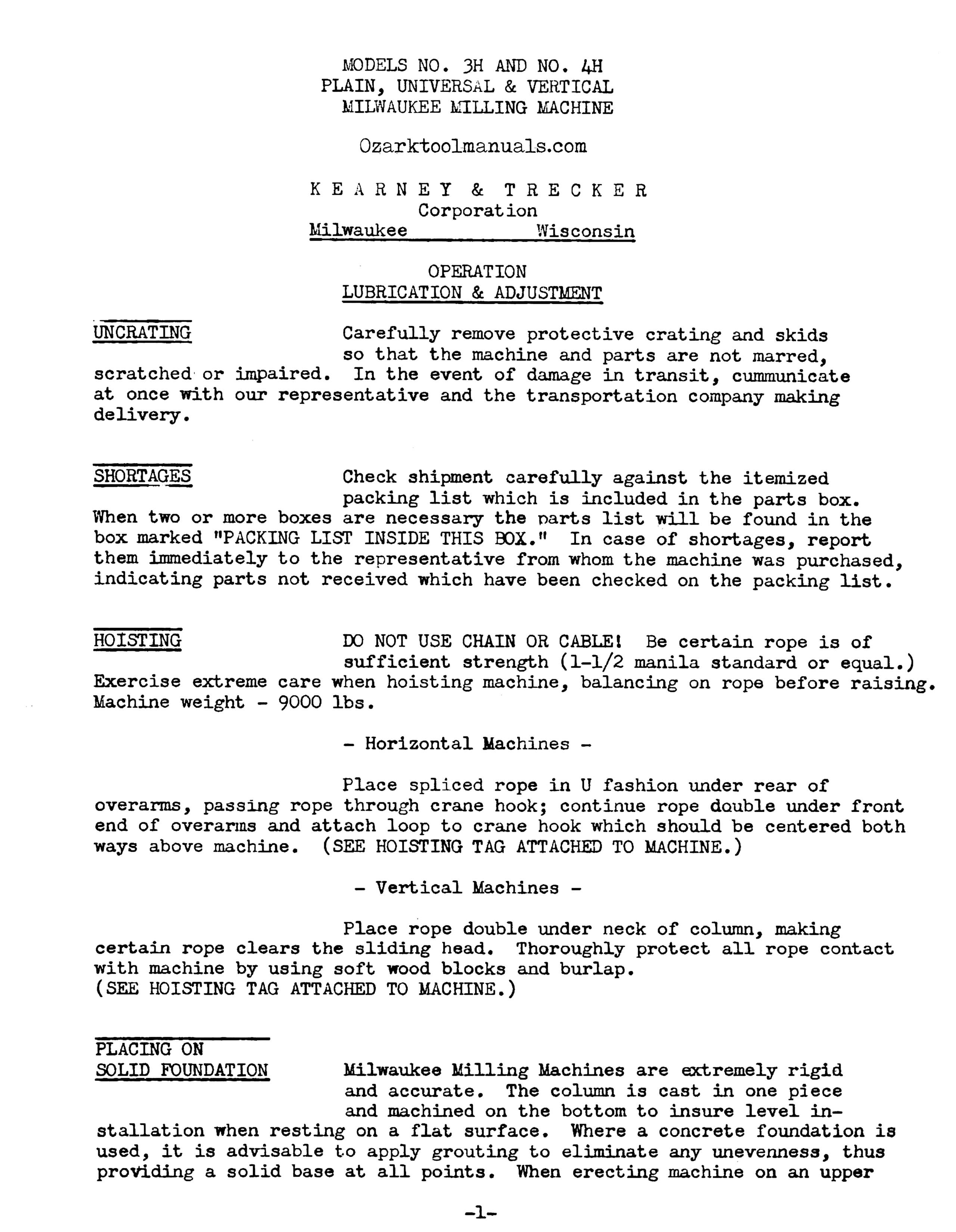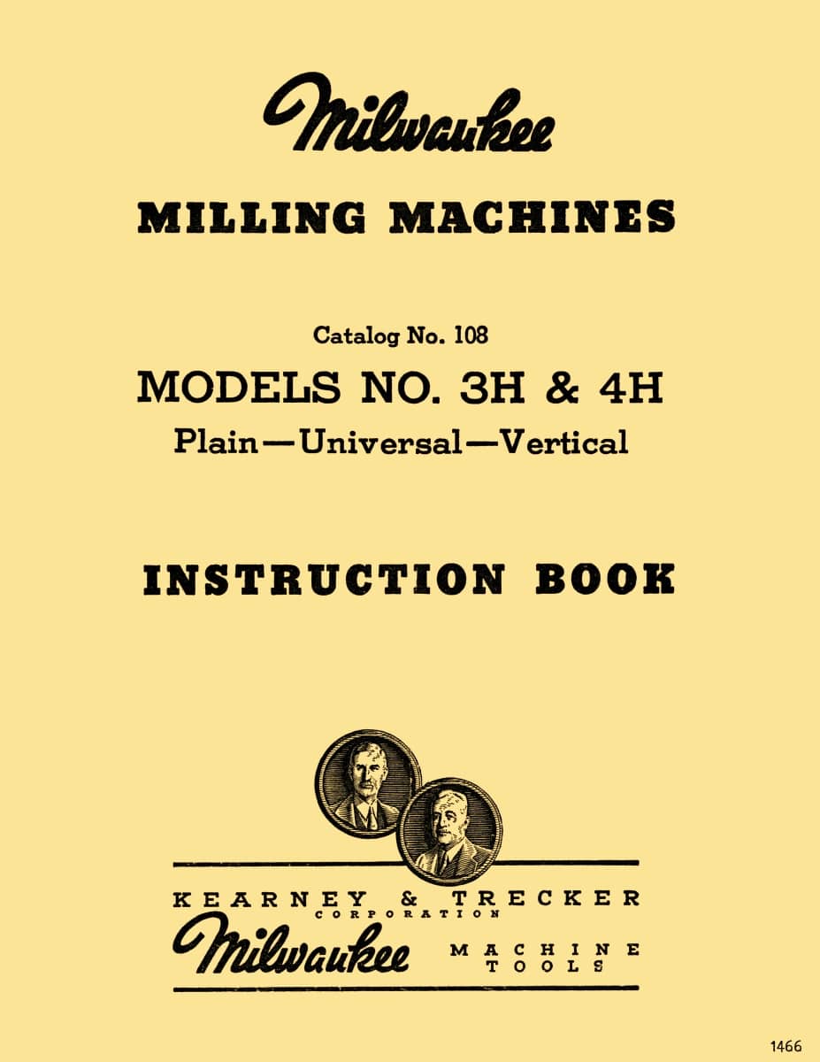 This is a reproduction, not a photocopy, of an original Kearney & Trecker Milwaukee Model 3H and 4H Plain, Universal, and Vertical Milling Machines Instructions Manual. This manual contains information on set-up, lubrication and reservoirs, operating instructions, and descriptions of how to adjust nearly everything. The only thing some dislike about the old Kearney & Trecker operator’s manual is that everything is explained by words, but the explanations are good.