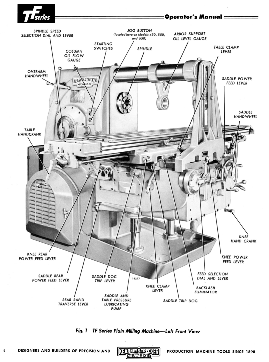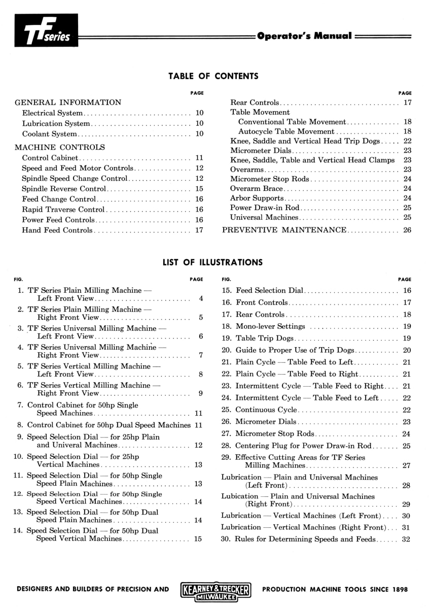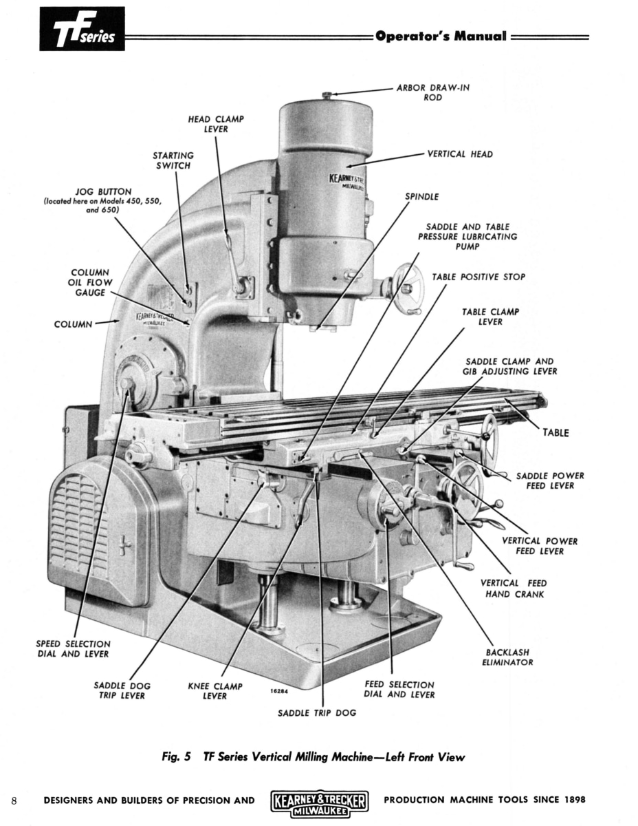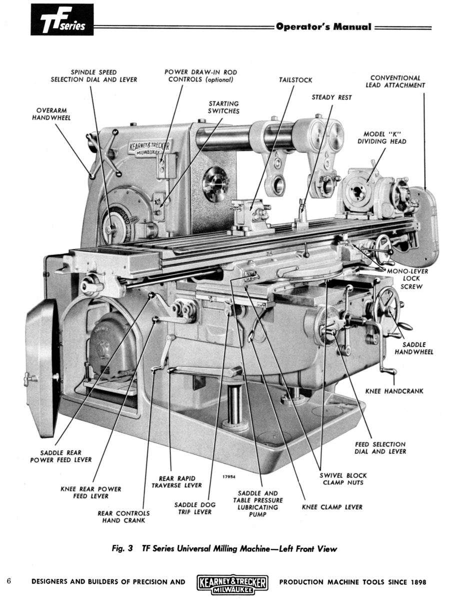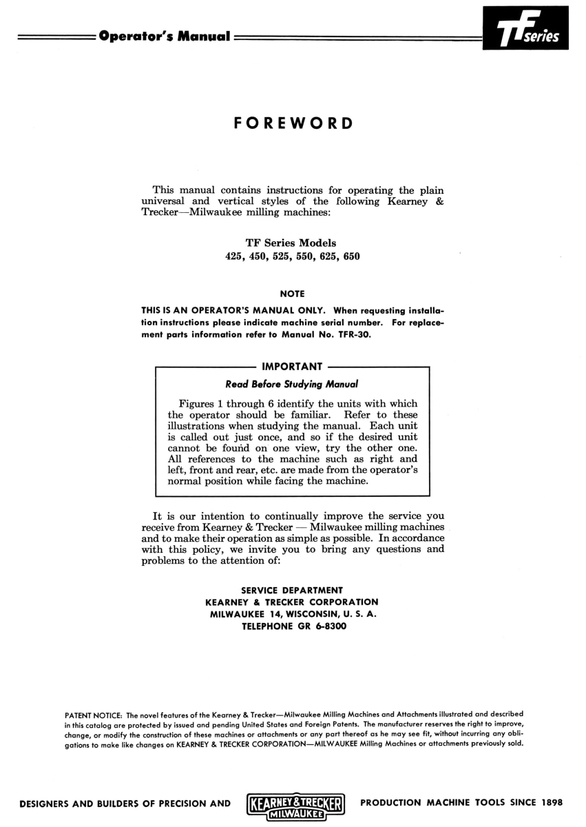 We also have installation and parts manuals for these Kearney & Trecker Mills as well. We also have an older TF series manual for operation as well. Feel free to text us photos of your machines to verify.