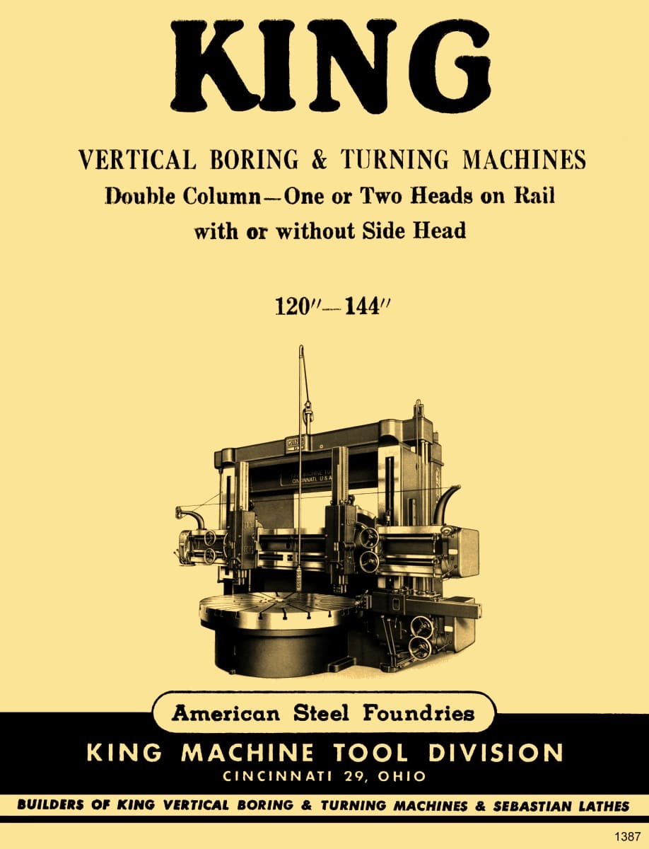 This is a reproduction, not a photocopy, of an original King 120″-144″ VTL Vertical Boring Turning Machine Parts Manual. This manual contains general operating instructions, but it is all text and expects you to have some knowledge of VTLs. The manual includes the specifications for each King VTL, and it contains cross-sectional views of the parts. This is the only manual with information that I’ve ever seen on these King VTLs.