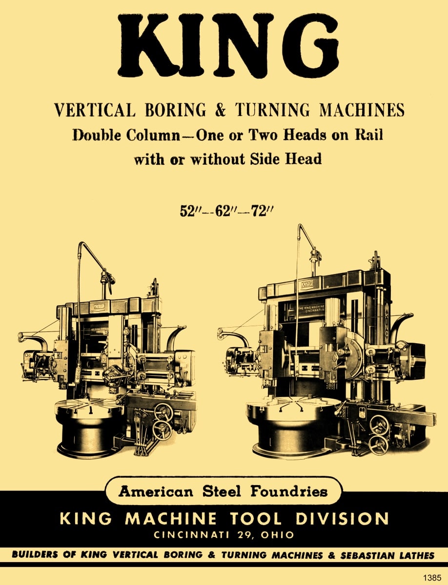This is a reproduction, not a photocopy, of an original King 52″-62″-72″ VTL Vertical Boring Turning Machine Parts Manual. This manual contains general operating instructions, but it is all text and expects you to have some knowledge of VTLs. The manual includes the specifications for each King VTL, and it contains cross-sectional views of the parts. This is the only manual with information that I’ve ever seen on these King VTLs.