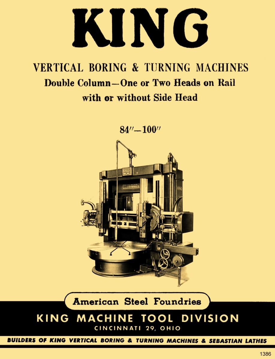 This is a reproduction, not a photocopy, of an original King 84″-100″ VTL Vertical Boring Turning Machine Parts Manual. This manual contains general operating instructions, but it is all text and expects you to have some knowledge of VTLs. The manual includes the specifications for each King VTL, and it contains cross-sectional views of the parts. This is the only manual with information that I’ve ever seen on these King VTLs.