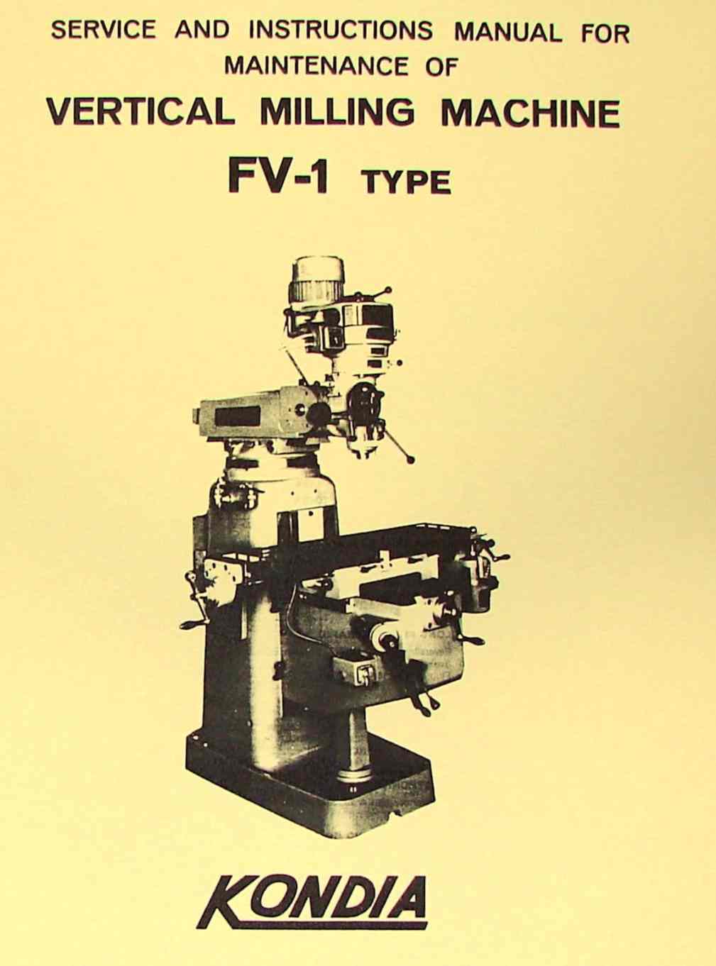 This is a reproduction, not a photocopy, of an original Kondia FV-1 Vertical Milling Machine Service and Maintenance Manual. This manual contains machine specifications, headstock alignment instructions, operating instructions, electrical diagrams, and lubricating instructions. This manual only contains diagrams for the FV-1 step pulley head
