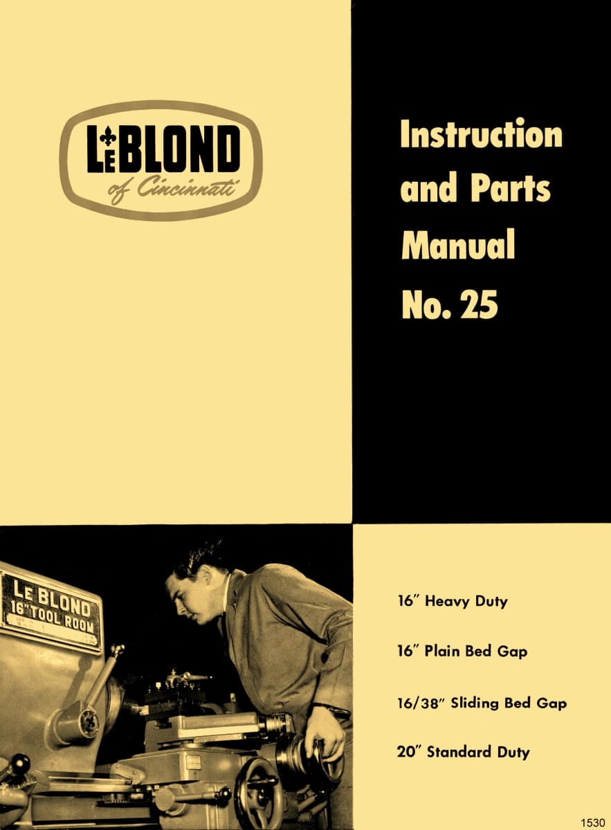 This is a reproduction, not a photocopy, of an original LeBlond 16″ Heavy Duty Lathes, 16″ Plain Bed Gap Lathes, 16/38″ Sliding Gap Lathes, and 20″ Standard Duty Metal Lathes Instruction and Parts Manual No. 25. This manual contains information on the lathe specifications, setting up this lathe, and proper operating procedures. The LeBlond lathe manual includes lubricating instructions and a complete set of cross-sectional view and explosive view diagrams of all the parts for these LeBlond metal lathes.