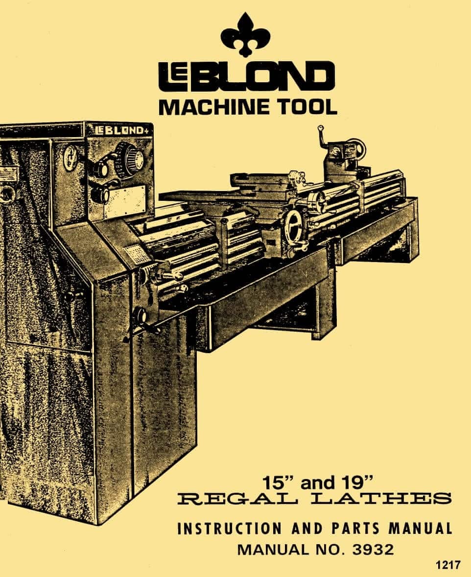 This is a reproduction, not a photocopy, of an original LeBlond Regal 13″, 15″, 17″, 19″ Lathe Instruction and Parts Manual No. 3932. This manual contains information on setting up this lathe, and proper operating procedures. The LeBlond lathe manual includes lubricating instructions and a complete set of parts diagrams.