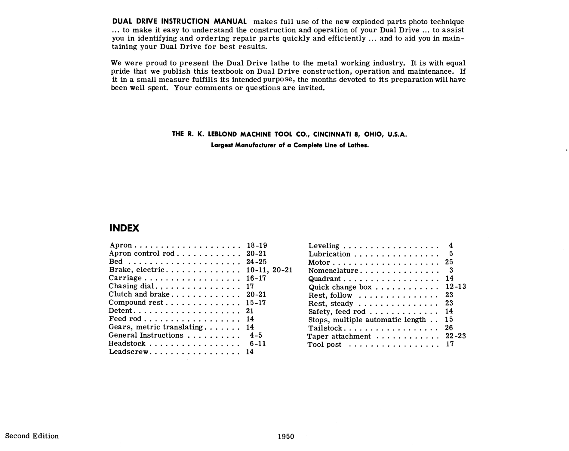 This is a reproduction, not a photocopy, of an original LeBlond Regal Dual Drive Metal Lathe Instruction and Parts Manual. This manual contains information on setting up this lathe, and proper operating procedures. The LeBlond lathe manual includes lubricating instructions and a complete set of explosive/pictorial view parts diagrams.