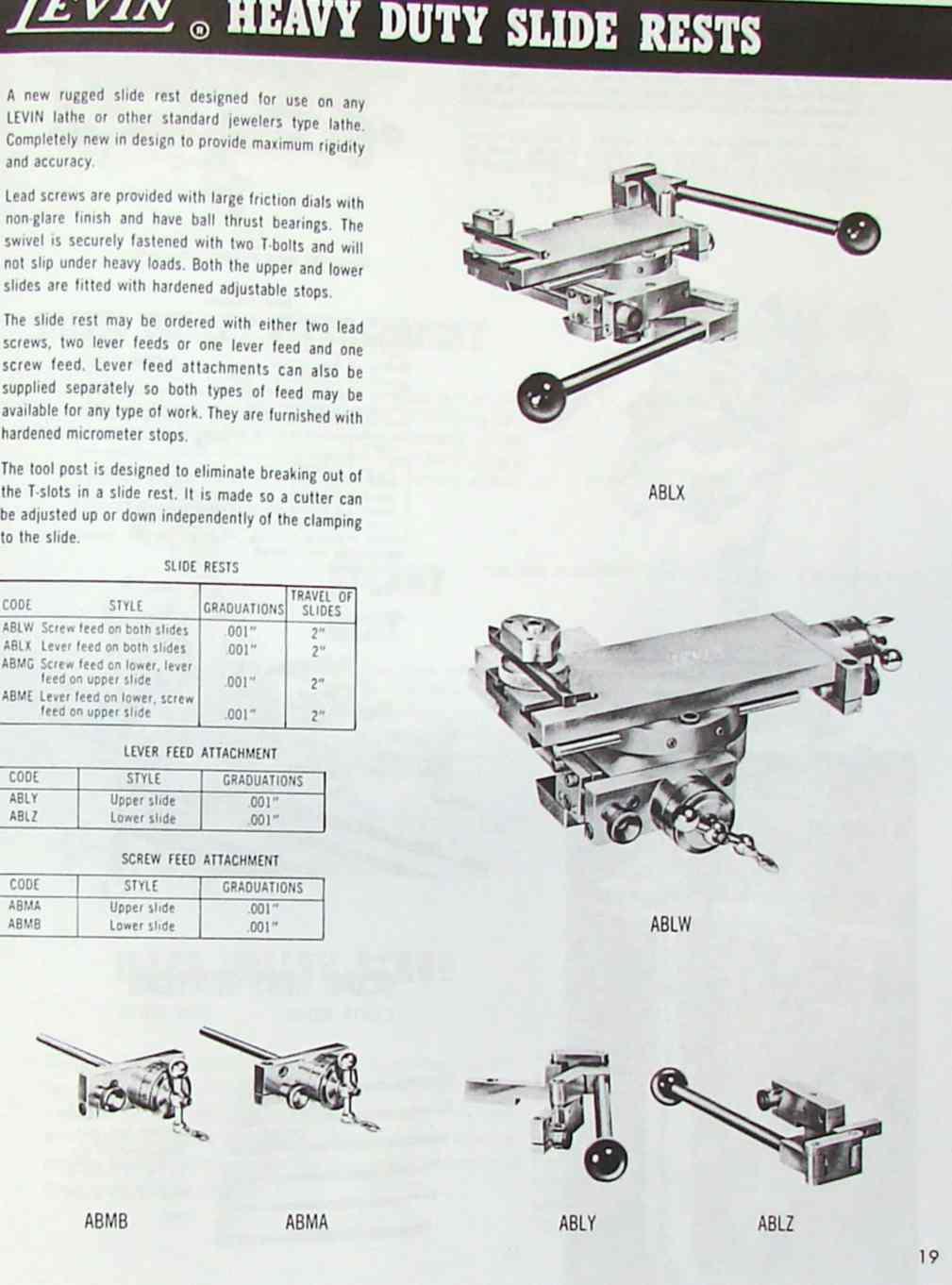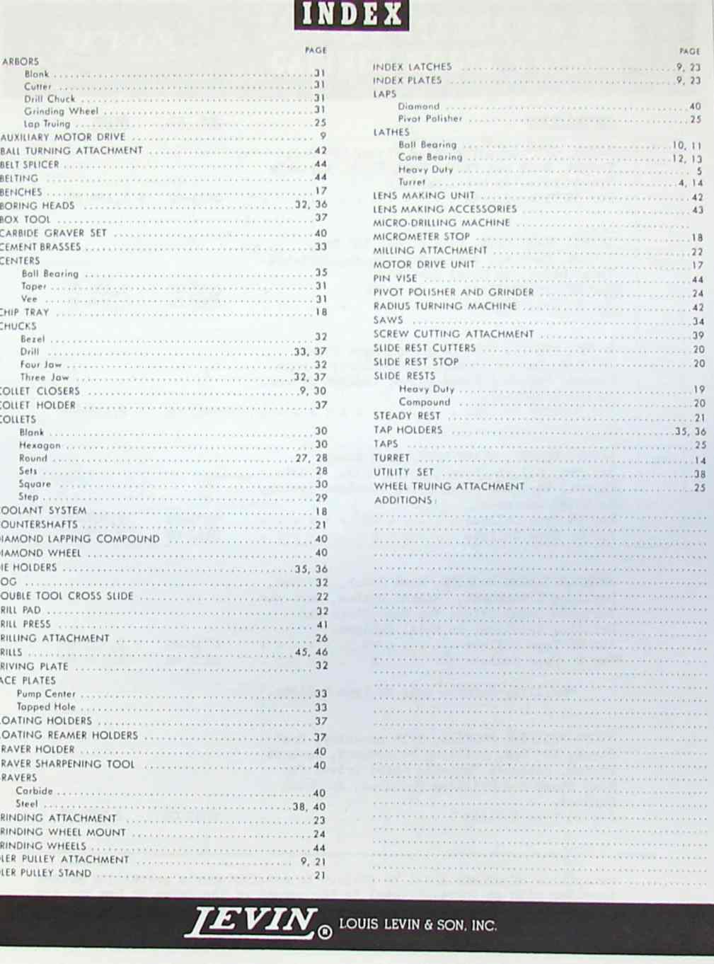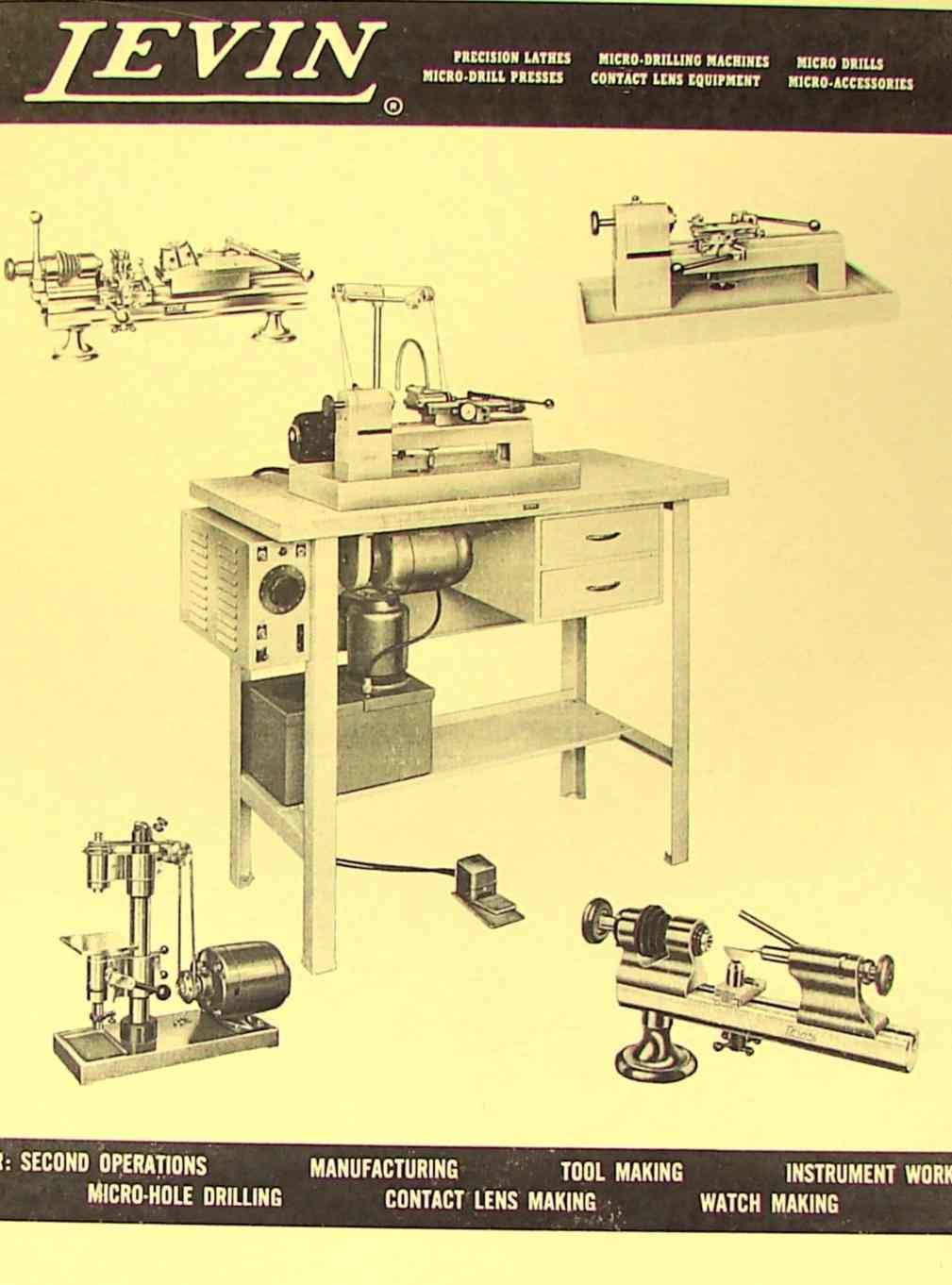 This is a reproduction, not a photocopy, of an original Levin Precision Lathes and Micro Drills Catalog. This catalog contains information on precision lathes, micro-drilling machines, micro drills, micro-drill presses, contact lens equipment, and micro-accessories. It list the catalog codes, specifications, and standard equipment sold with the machines. This catalog is a great resource for these fine machines.