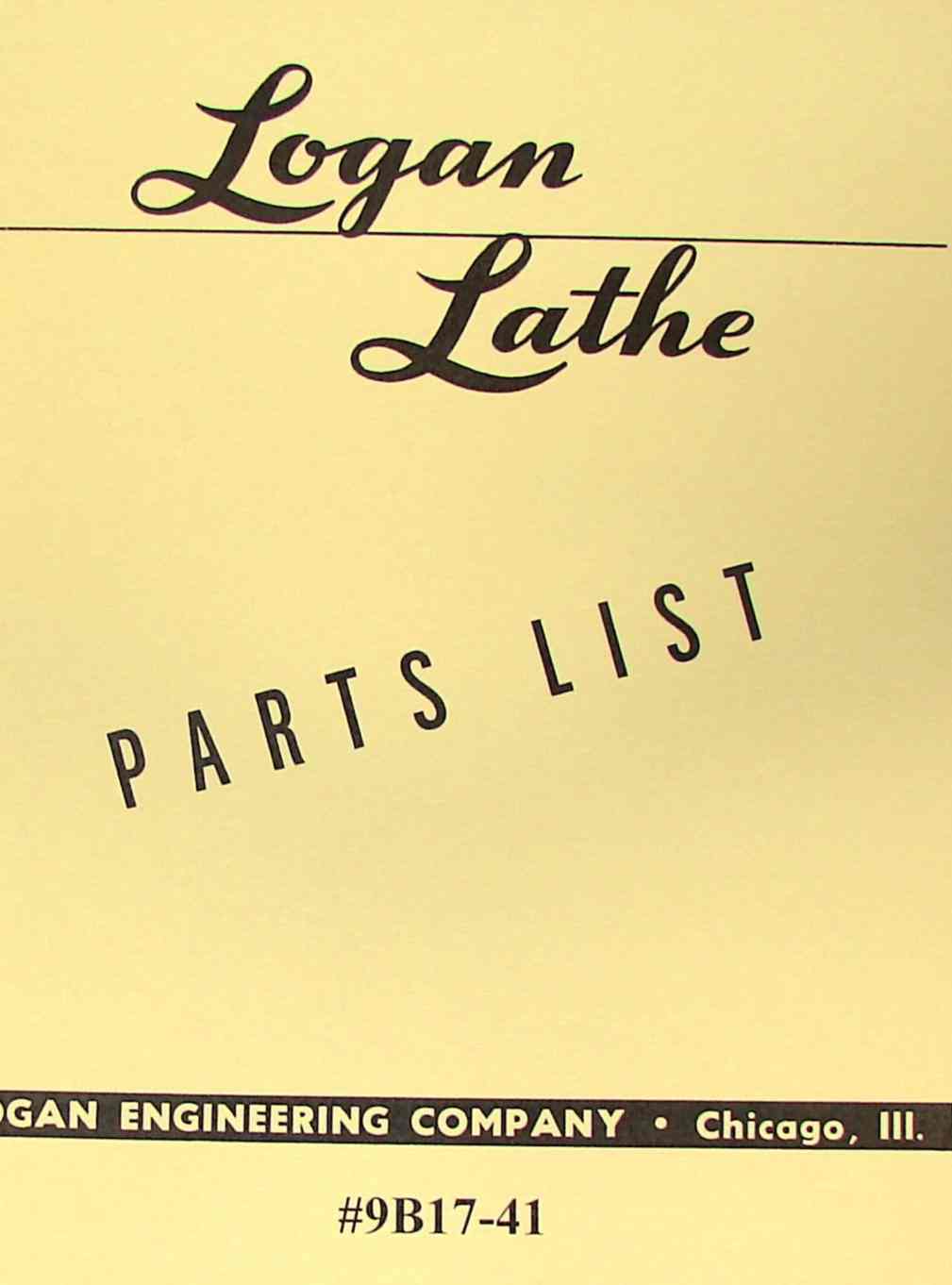 This is a reproduction, not a photocopy, of an original Logan Metal Lathe 9B17-41 Parts List Manual. This manual covers all of the parts for this lathe with nice exploded view diagrams.