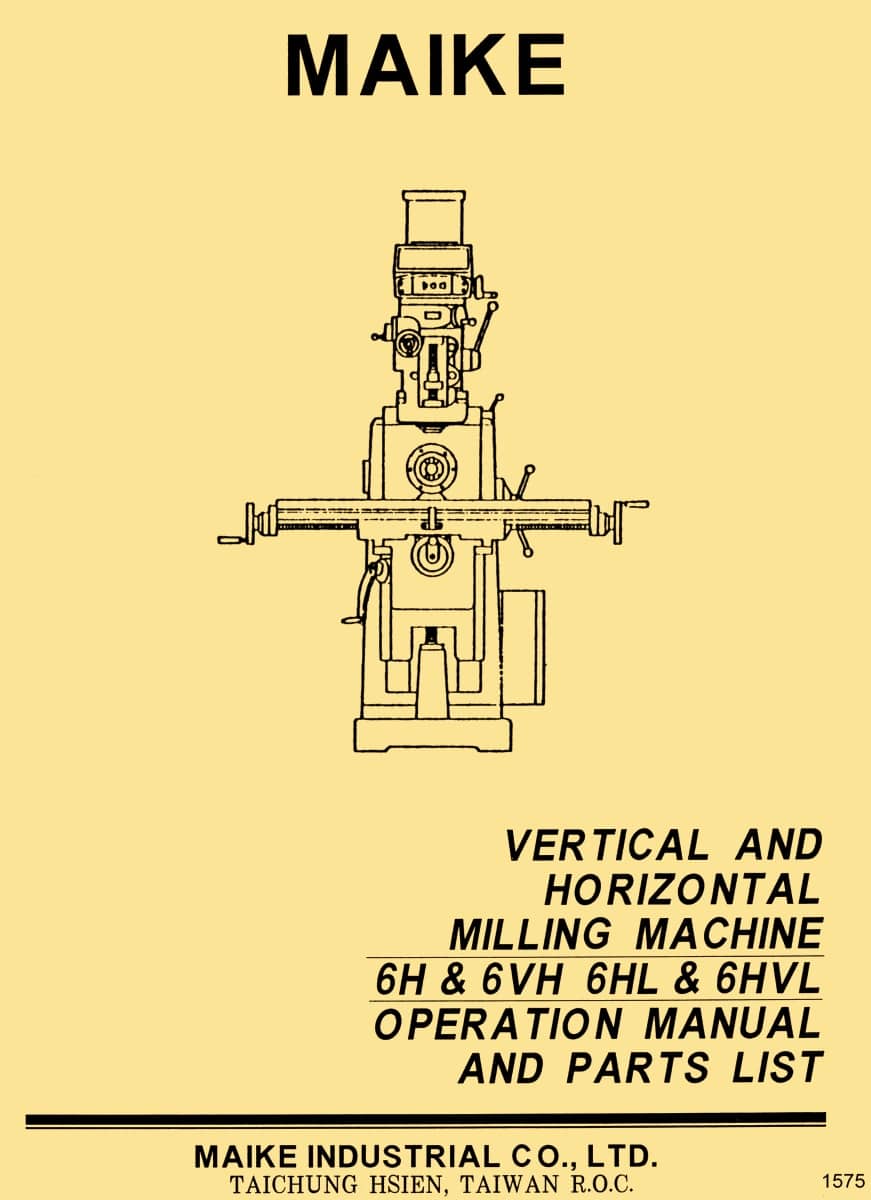 This is a reproduction, not a photocopy, of an original Maike Vertical and Horizontal Milling Machine Operation and Parts Manual. This manual covers the models 6H, 6VH, 6HL, and 6HVL Milling Machines. This manual contains information on the milling machine specifications, lubricating instructions, instructions on different adjustments, how to replace the belts, and a wiring diagram. The Maike mill manual also has clear explosive view diagrams of all the parts with parts list and descriptions.