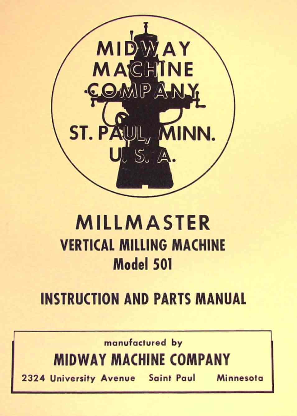 This is a reproduction, not a photocopy, of an original Midway Machine Company Millmaster Model 501 Vertical Milling Machine Operator’s and Parts Manual. This manual contains information installing and setting up the mill as well as lubricating instructions with a chart. It also has operating instructions and speed charts for the different pulley operations, and it covers both the two pulley and three pulley configuration. The manual also has a wiring diagram, and it has cross-sectional view diagrams of all the parts.