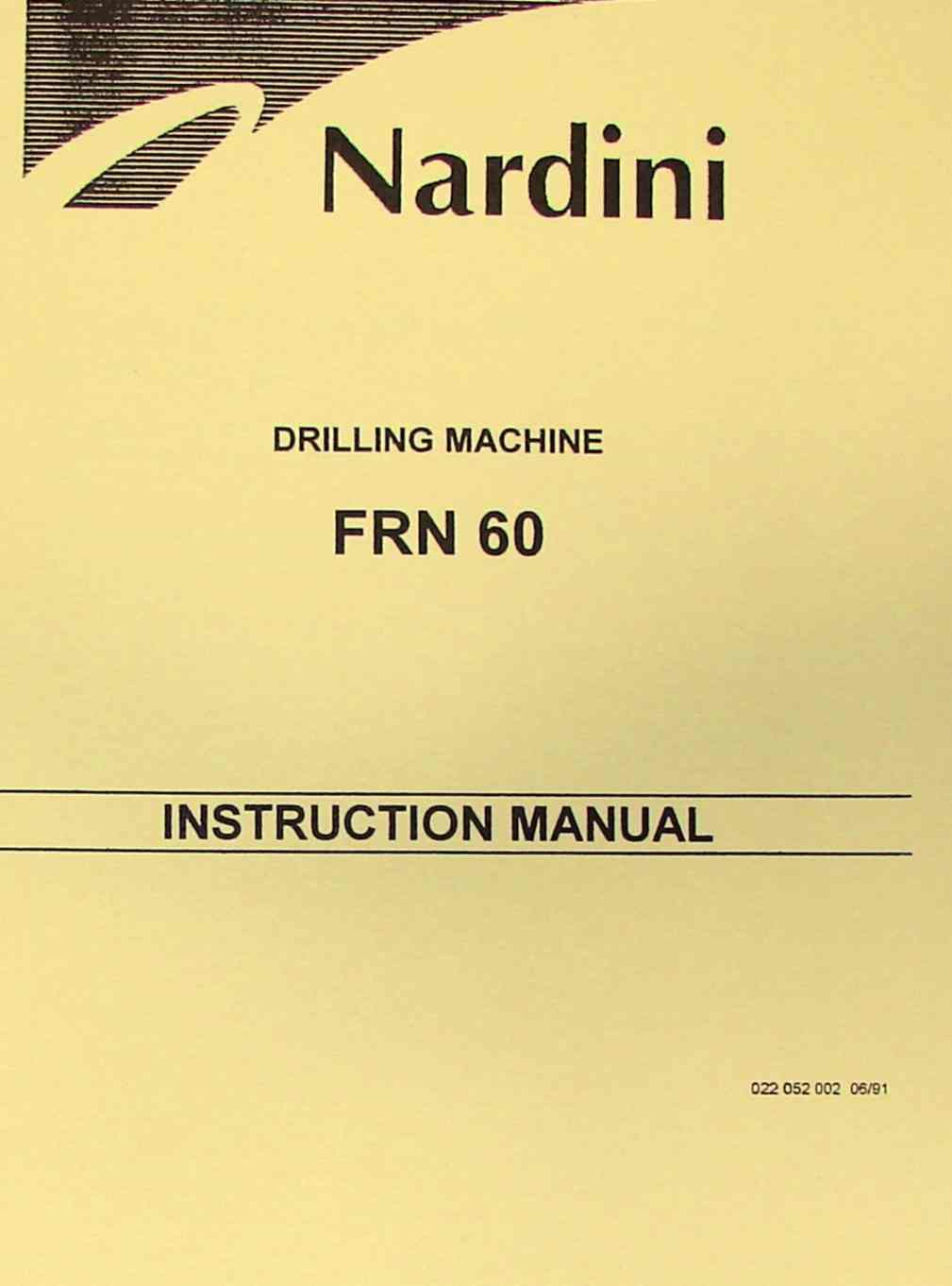 This is a reproduction, not a photocopy, of an original Nardini FRN 60 Drilling Machine Instructions and Parts manual. This manual contains information on set up, lubrication, maintenance, wiring diagrams, and controls as well as a complete parts list and exploded view diagrams.