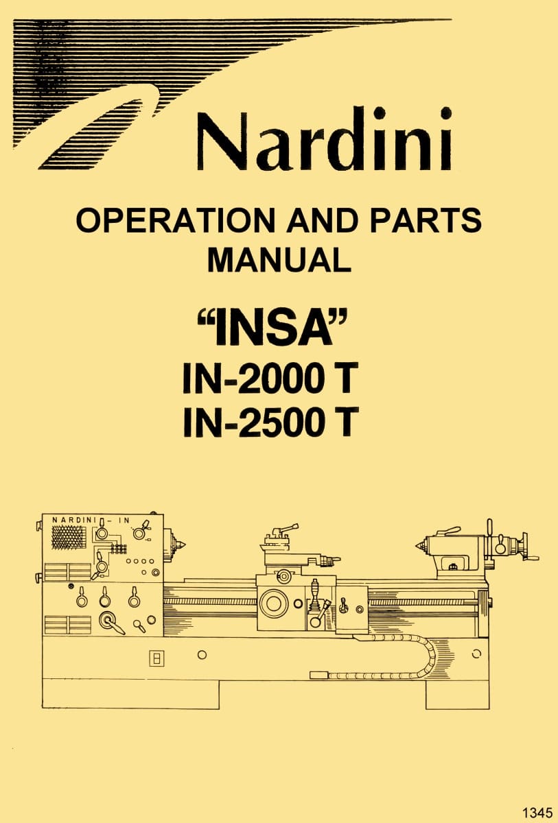 This is a reproduction, not a photocopy, of an original Nardini INSA IN-2000T and IN-2500T Series Metal Lathes Instructions and Parts Manual. This manual contains information on operating instructions, machine specifications, proper lubrication instructions, adjustments, wiring diagrams, and a complete set of exploded view diagrams of the parts with descriptions for these Nardini Lathes.