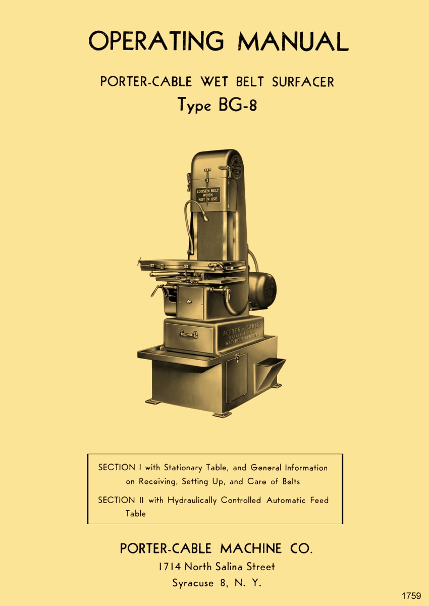 This is a reproduction, not a photocopy, of an original Porter-Cable Machine Co. Large Wet Belt Surfacer Sander Type BG-8 Instructions and Parts Manual. Section 1 covers models with a stationary table, and general information on receiving, setting up, and caring for the belts. Section 2 covers models with a hydraulically controlled automatic feed table. There is a cross-sectional view diagram that shows a lot of the inner workings of the sander. It has a lot of good, detailed instructions on setting it up and operating it properly. This is an old manual, so there aren’t a lot of diagrams, but there are a bunch of black and white photos at the end to explain the paragraphs of information.