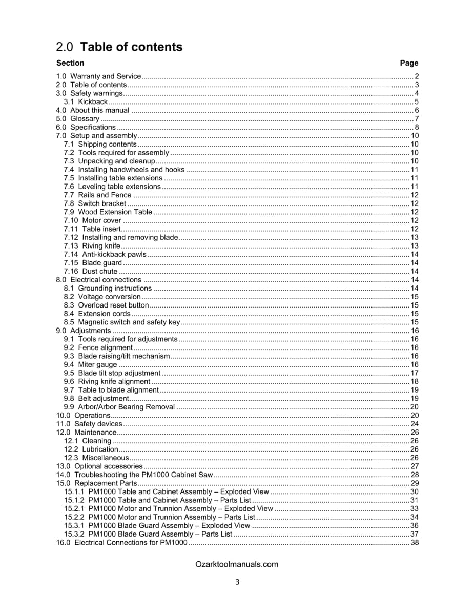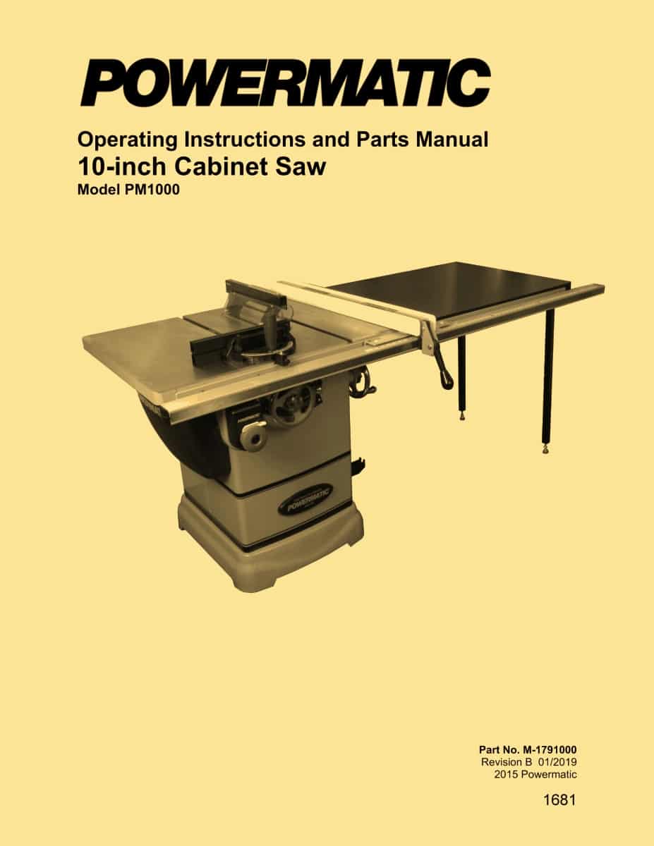 This is a reproduction, not a photocopy, of an original Powermatic Model PM1000 10-inch Cabinet Table Saw Instruction and Parts Manual. This manual contains information on the table saw specifications, installation instructions, and proper operating instructions. There are several pages on making different adjustments to the saw to make accurate cuts. The manual has wiring diagrams and a complete set of clear explosive view diagrams of all the parts with parts list and descriptions for this Powermatic table saw.